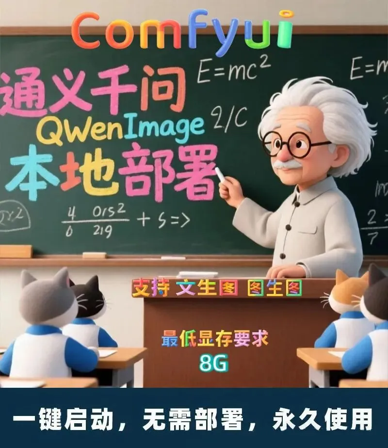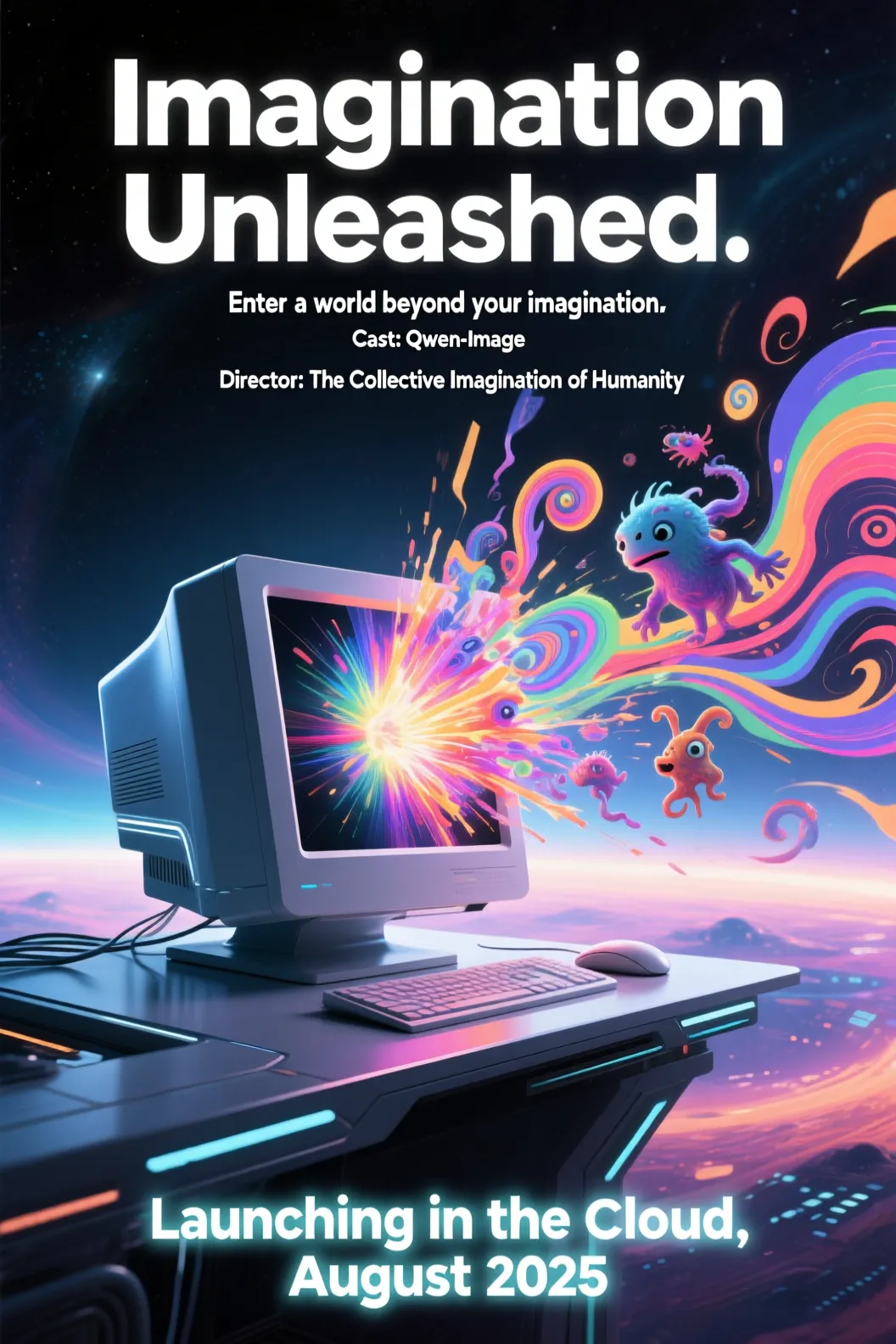 提示词:A movie poster. The first row is the movie title, which reads “Imagination Unleashed”. The second row is the movie subtitle, which reads “Enter a world beyond your imagination”. The third row reads “Cast: Qwen-Image”. The fourth row reads “Director: The Collective Imagination of Humanity”. The central visual features a sleek, futuristic computer from which radiant colors, whimsical creatures, and dynamic, swirling patterns explosively emerge, filling the composition with energy, motion, and surreal creativity. The background transitions from dark, cosmic tones into a luminous, dreamlike expanse, evoking a digital fantasy realm. At the bottom edge, the text “Launching in the Cloud, August 2025” appears in bold, modern sans-serif font with a glowing, slightly transparent effect, evoking a high-tech, cinematic aesthetic. The overall style blends sci-fi surrealism with graphic design flair—sharp contrasts, vivid color grading, and layered visual depth—reminiscent of visionary concept art and digital matte painting, 32K resolution, ultra-detailed.