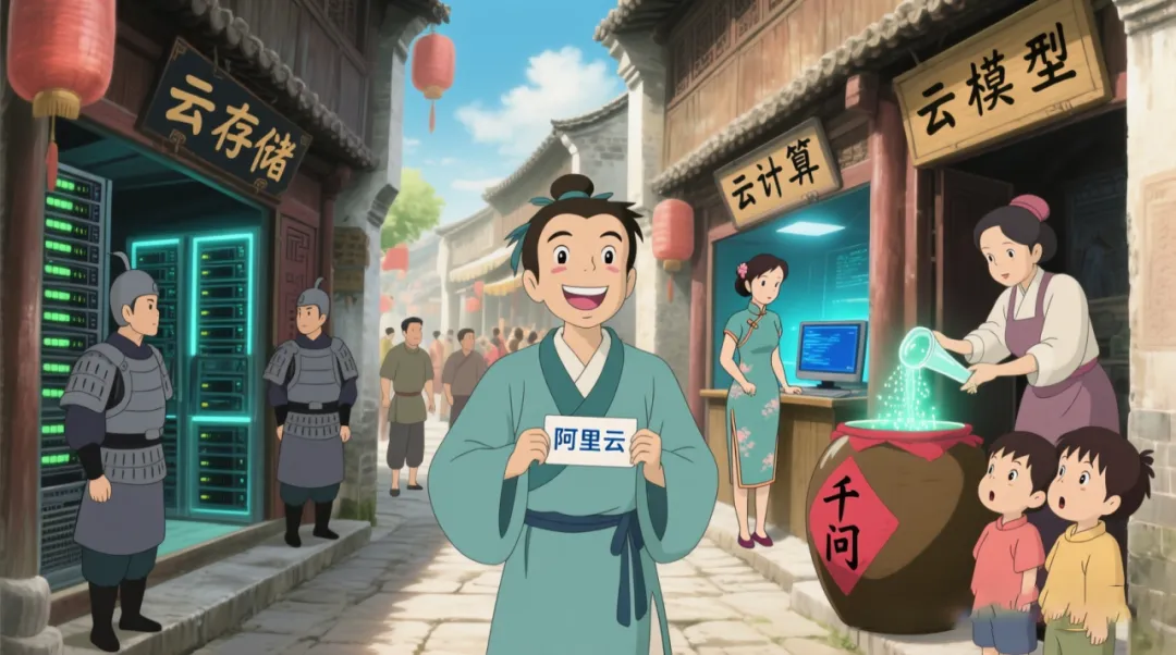提示词:宫崎骏的动漫风格。平视角拍摄,阳光下的古街热闹非凡。一个穿着青衫、手里拿着写着“阿里云”卡片的逍遥派弟子站在中间。旁边两个小孩惊讶的看着他。左边有一家店铺挂着“云存储”的牌子,里面摆放着发光的服务器机箱,门口两个侍卫守护者。右边有两家店铺,其中一家挂着“云计算”的牌子,一个穿着旗袍的美丽女子正看着里面闪闪发光的电脑屏幕;另一家店铺挂着“云模型”的牌子,门口放着一个大酒缸,上面写着“千问”,一位老板娘正在往里面倒发光的代码溶液。