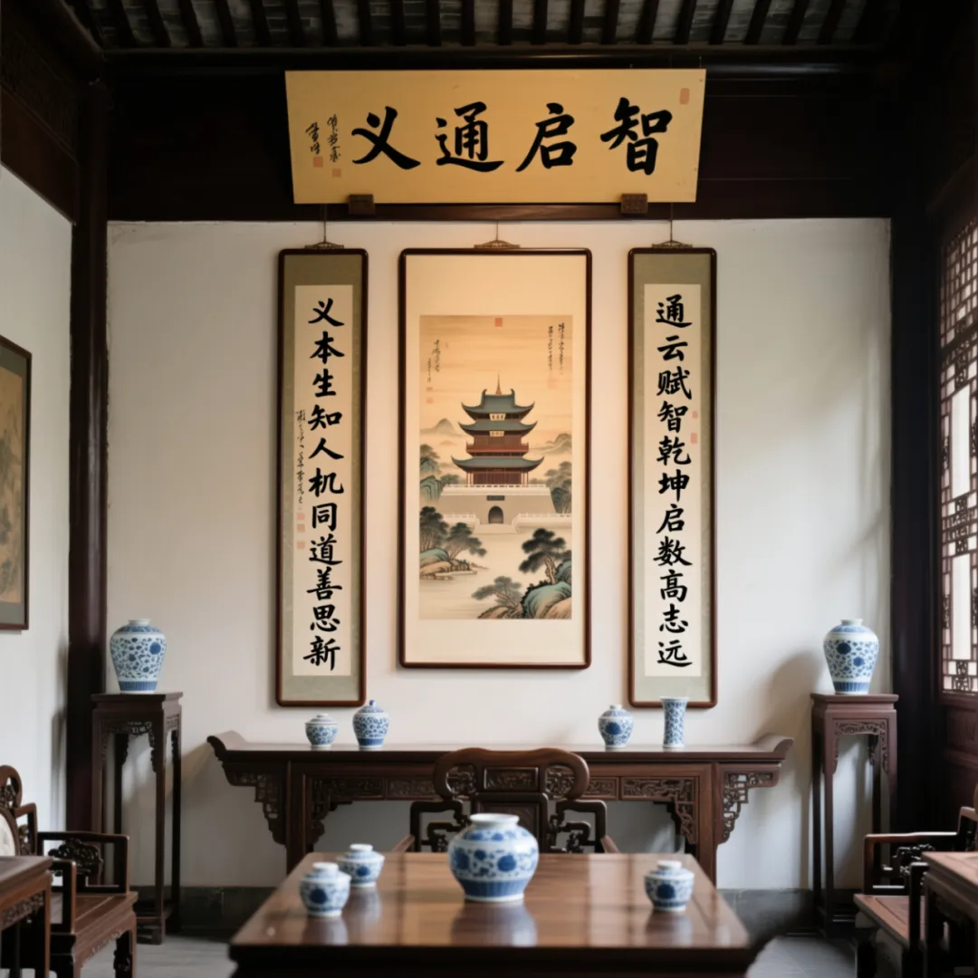 提示词:一副典雅庄重的对联悬挂于厅堂之中,房间是个安静古典的中式布置,桌子上放着一些青花瓷,对联上左书“义本生知人机同道善思新”,右书“通云赋智乾坤启数高志远”, 横批“智启通义”,字体飘逸,中间挂在一着一副中国风的画作,内容是岳阳楼。