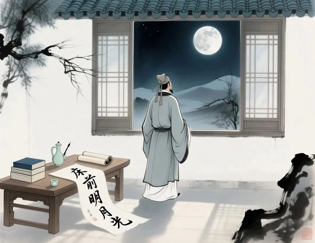 提示词:李白站在窗前写“床前明月光”,窗外明月当空,在屋内投下柔和的光线,书桌上有酒和书籍,整体风格古典