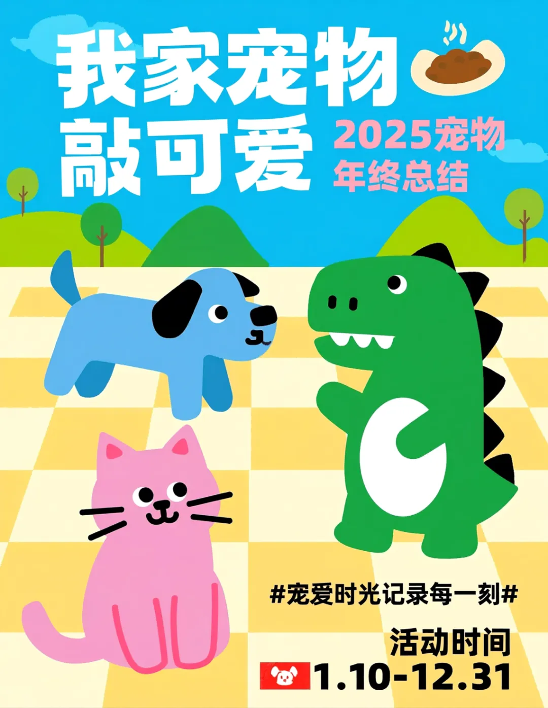 一张宠物活动宣传海报。主视觉为三个扁平卡通插画风格的宠物形象,分别是蓝色狗,绿色恐龙和粉色猫,形象可爱且色彩鲜艳。宠物形象均匀分布在浅黄色棋盘格背景上,标题位于海报顶部,分上下排,上排“我家宠物”,下排“敲可爱”,字体较大,颜色为白色,副标题“2025宠物年终总结”位于右上方,活动主题“#宠爱时光记录每一刻”位于海报底部右侧,活动日期“活动时间 11.10-12.31”位于海报底部左侧,字体较小,颜色为红色和黑色,顶部有蓝色天空,点缀绿色山丘和小树,右上角有宠物食物图标,整体构图轻松活泼,色彩鲜明,童趣搞怪。