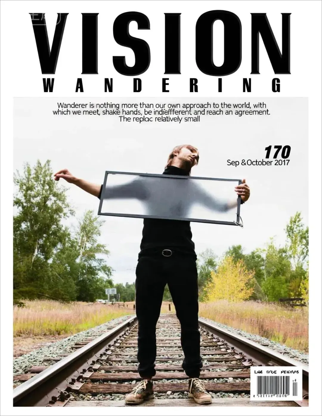 A magazine cover design for the Grassland Music Festival. The main visual is a figure wearing black clothing and holding a transparent drawing board, standing on the railway track with natural scenery in the background, including trees and grass. The title ‘VISION’ is located at the top of the cover, with large and thick font and black color. The subtitle ‘WANDERING’ is located below the title and has a slightly smaller font size. There is an introduction in the middle of the cover: Wanderer is nothing more than our own approach to the world, with which we meet, shake hands, be indifferent, and reach an agreement.’, The font size is relatively small. Label the price ‘170’ and the number of periods’ Sep.&October 2017 ‘in the bottom right corner. The overall composition is balanced, the colors are natural, the style is simple, and the wandering and exploratory spirit of the theme is highlighted.