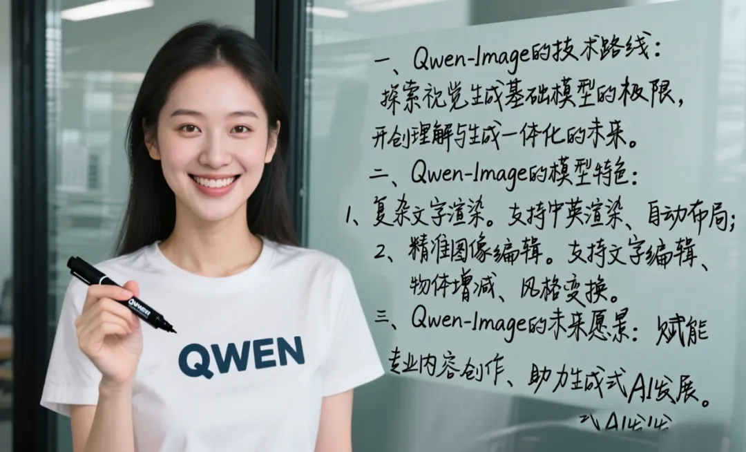 提示词:一个穿着”QWEN”标志的T恤的中国美女正拿着黑色的马克笔面相镜头微笑。她身后的玻璃板上手写体写着 “一、Qwen-Image的技术路线: 探索视觉生成基础模型的极限,开创理解与生成一体化的未来。二、Qwen-Image的模型特色:1、复杂文字渲染。支持中英渲染、自动布局; 2、精准图像编辑。支持文字编辑、物体增减、风格变换。三、Qwen-Image的未来愿景:赋能专业内容创作、助力生成式AI发展。”