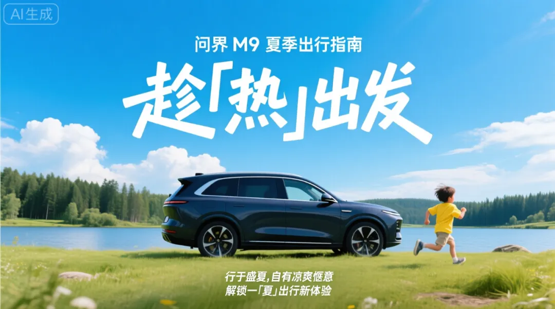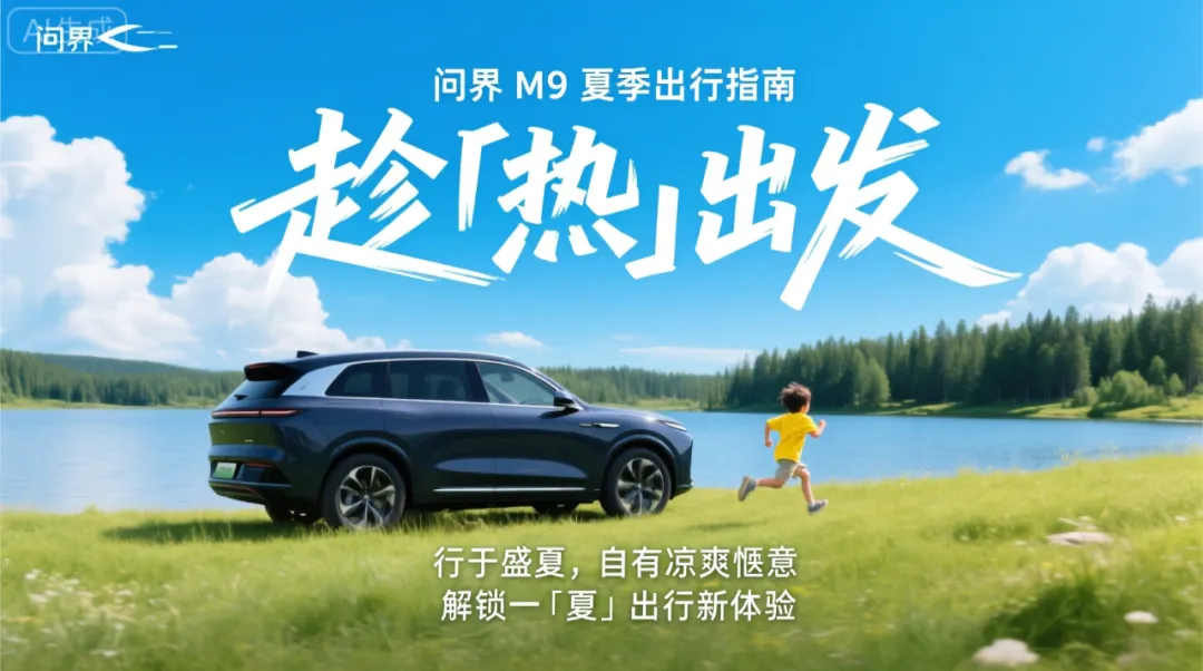 一张展示夏季出行的汽车广告海报。主视觉为一辆深色SUV停在湖边草地上,旁边是一个穿着黄色上衣的小孩在奔跑。背景是晴朗的蓝天、洁白的云朵和远处的森林,营造出一种清新自然的氛围。海报的上半部分是副标题“问界 M9 夏季出行指南”,颜色为白色。紧接着是主标题“趁『热』出发”,字体设计独特,大而醒目,颜色为白色,位于海报中央。底部宣传语“行于盛夏,自有凉爽惬意 解锁一『夏』出行新体验”,字体较小。构图纵深感强烈,给人一种身临其境的感觉,整体色彩鲜明,突出夏日出行的清凉和愉悦。