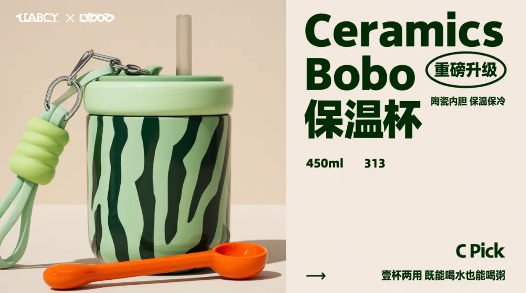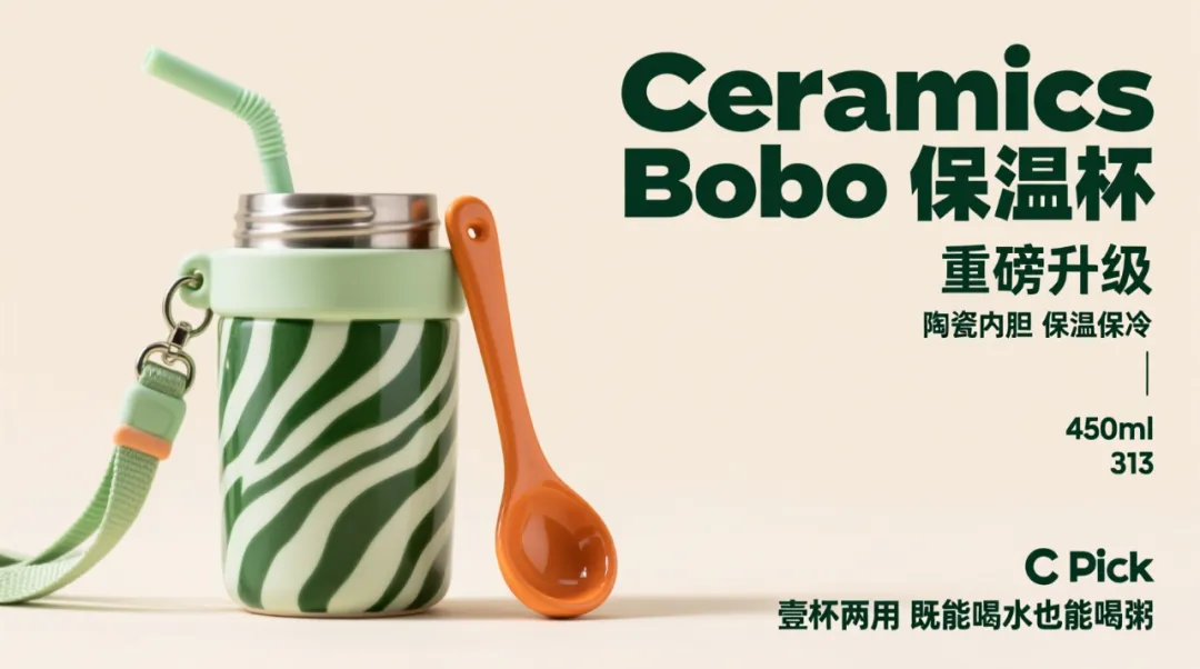 一款陶瓷内胆保温杯的宣传海报。主视觉为一款绿色斑马纹设计的保温杯,配有浅绿色色硅胶吸管和挂带,以及一个橙色陶瓷长柄勺。背景为浅米色,突出产品。标题“Ceramics Bobo 保温杯”位于右侧,字体大而醒目,颜色为深绿色,副标题“重磅升级”位于标题右侧,字体较小,下方标注“陶瓷内胆 保温保冷”,“450ml”和“316”材质信息,字体较小,底部有“C Pick”标志和“壹杯两用 既能喝水也能喝粥”的宣传语,字体中等,颜色为深绿色。整体构图简洁,色彩搭配和谐,突出产品的多功能性和设计感。