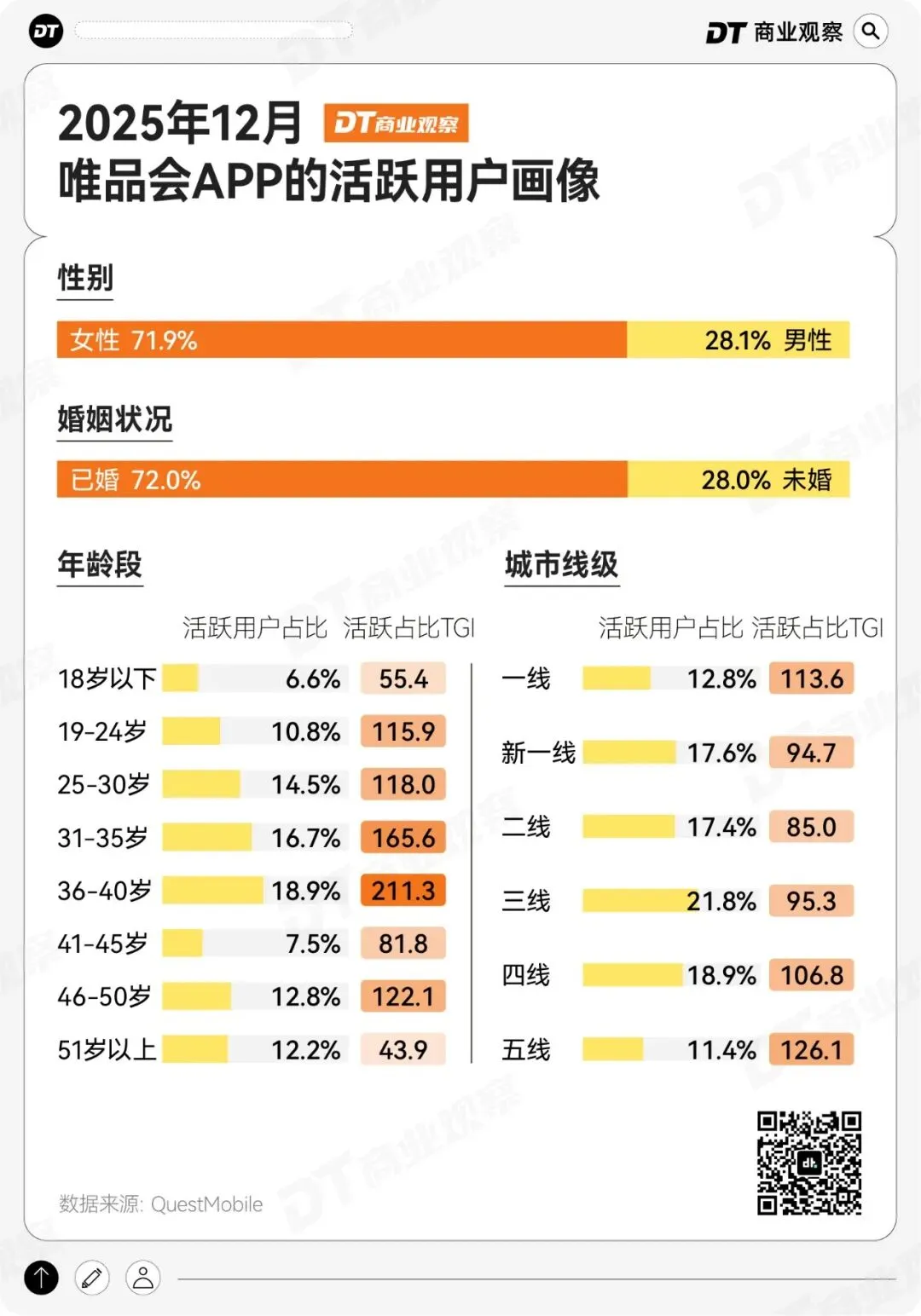 根据QuestMobile 2025年12月的用户画像,在唯品会的活跃用户中,女性占比高达71.9%,已婚占比72%,25-40岁之间的用户合计占比超过50%,是当之无愧的主力。
