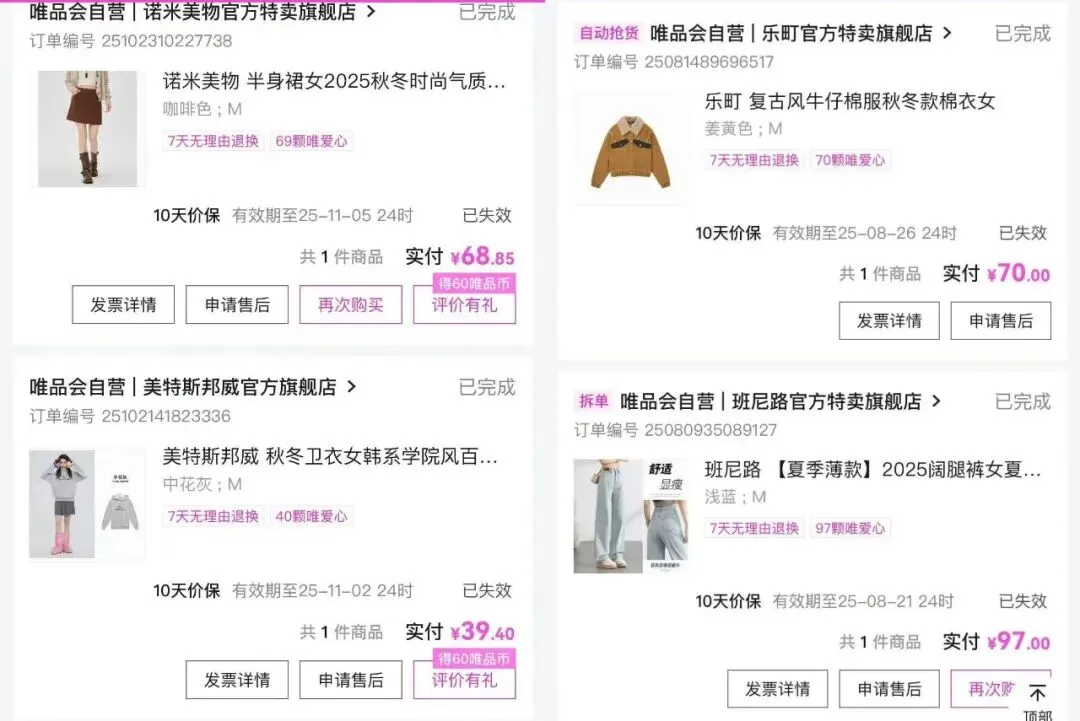 (一颗欣子在唯品会上的购物订单,图源受访者)