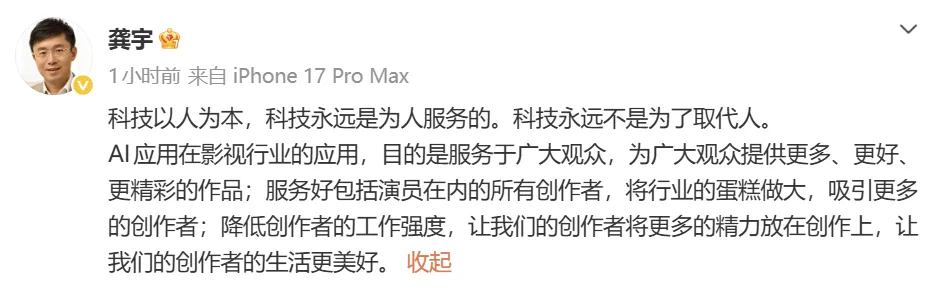 爱奇艺CEO连续发文回应“AI艺人库”:科技永远不是为了取代人
