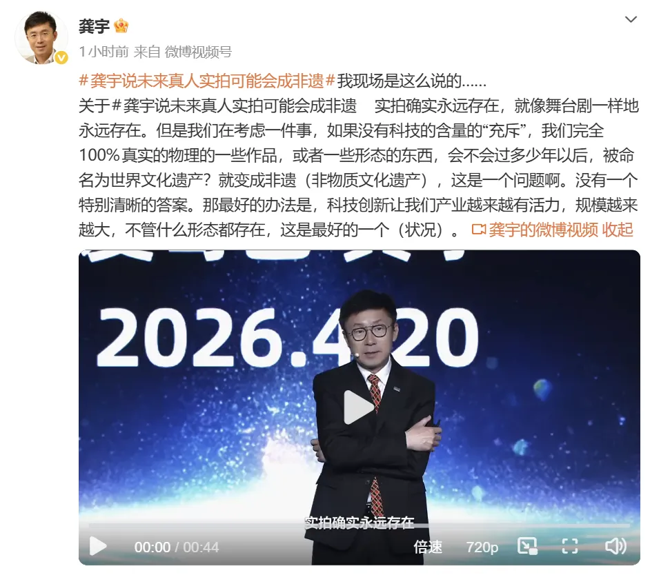 此外,龚宇还回应了“龚宇说未来真人实拍可能会成非遗”话题词,并称:“我现场是这么说的,实拍确实永远存在,就像舞台剧一样地永远存在。但是我们在考虑一件事,如果没有科技的含量的‘充斥’,我们完全100%真实的物理的一些作品,或者一些形态的东西,会不会过多少年以后,被命名为世界文化遗产?就变成非遗(非物质文化遗产),这是一个问题啊。没有一个特别清晰的答案。那最好的办法是,科技创新让我们产业越来越有活力,规模越来越大,不管什么形态都存在,这是最好的一个(状况)。”