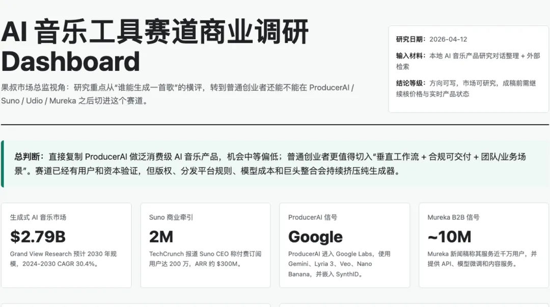 这两天我在看 AI 音乐工具,起因是 Google Labs 推出的 ProducerAI。这个产品让我重新看了一遍 Suno、Udio、Mureka 这一批 AI 音乐产品,也顺手做了一个小型调研 Dashboard。
