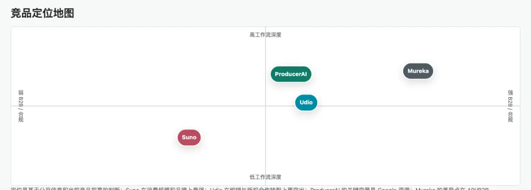 这张定位图里,我把横轴理解为 B2B / 合规强弱,纵轴理解为工作流深度。Suno 偏消费端入口,Udio 偏编辑工作流,ProducerAI 依靠 Google 资源向工作区和多模态链路延伸,Mureka 则更靠近 API 和 B2B。