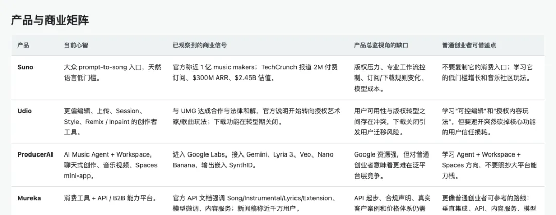 我这次不想把文章写成“某某产品体验报告”。单纯比较谁生成得更好听,意义不大。更值得讨论的问题是:当 ProducerAI、Suno、Udio、Mureka 已经分别站到不同位置以后,普通创业者和个人开发者还有没有机会进入 AI 音乐工具赛道?