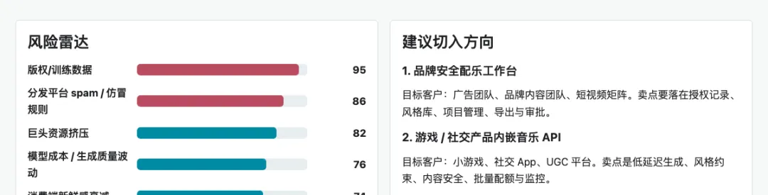上面这张是我从调研 Dashboard 里截出来的市场规模和机会排序。需要注意,机会评分属于基于公开资料和产品判断做出的策略排序,不是外部统计。这里最值得看的也不是 2030 年市场能到多少,而是“大众生成器克隆”的评分明显低于“合规品牌安全”“垂直工作台”和“API/嵌入能力”。