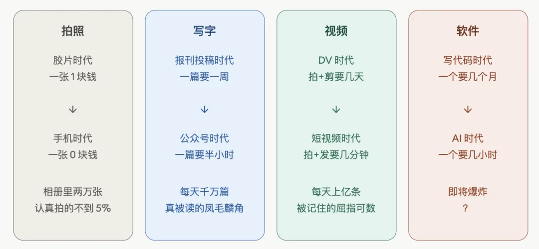 这几天思考,软件会是新的消费品。消费品,就是我们日常买的衣服,日用品等,随手买,随手用,随手扔,因为变化太快,以至于很少有能持续用几年的商品。在 AI 发展历程中,到现在软件其实已经消费品化了,虽说不至于说人人都可以随手创建软件。但凡你会用个 AI 工具,就可以构建自己需要的软件。就有点类似现实世界中的商品供应链,你想要任何商品,都有配套成熟的供应链,价格可以很便宜。在数字世界中,软件成本更低,就是 0 成本。后续软件供给会无限,会井喷,以至于单个软件的生命周期会变短。过去一个产品做个七八年是常事,以后可能一个产品两年就到生命周期尽头了,不是你做得不好,是这个赛道里每两个月都有十个新的替代品出现。真正有价值的会是品牌、是用户心智、是那种”一提到某件事你脑子里就是这个 App”的默认选择。因为在供给无限的世界里,用户唯一的稀缺资源是注意力。软件会越来越多,能被记住的会越来越少。成本塌了一切就都变了。照片是这样,文字是这样,视频是这样,软件不会例外。