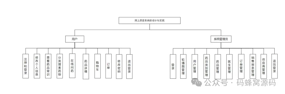 药品管理系统包括登录、 用户管理、药品分类管理、药品管理、用药常识管理、订单管理、医生管理、修改用户名、修改密码的功能模块设计如图 :