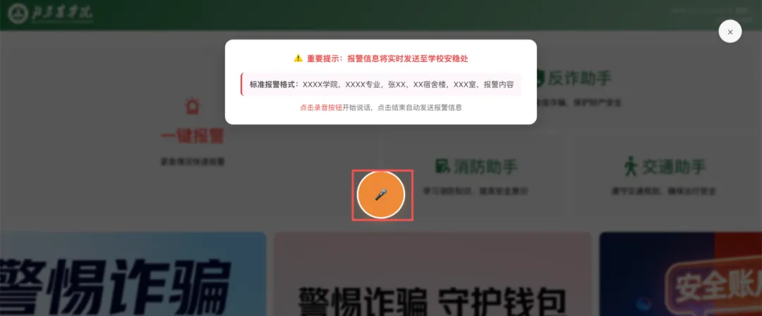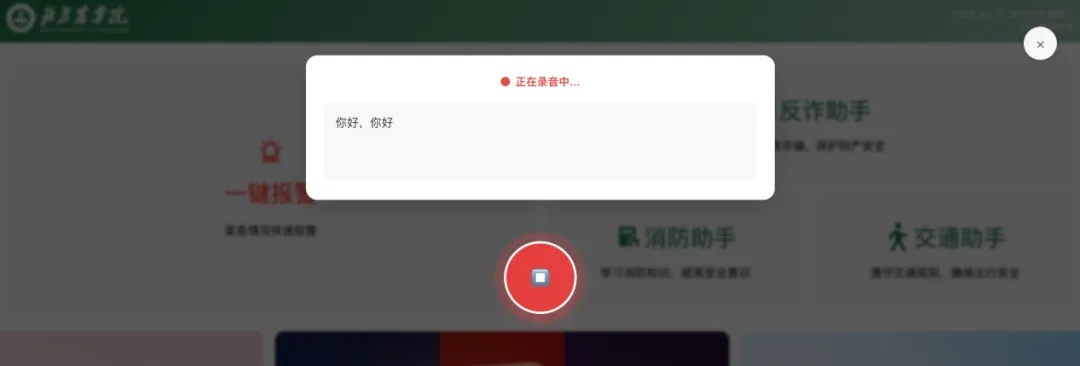 1.3、当您说话结束后,点击结束按钮,报警信息便会自动发送到学校安稳处。这一过程无需您进行额外的操作,系统会按照预设的程序将报警内容准确无误地传递过去。