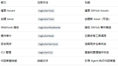 最后,在入口文件index.ts中把前面所有的模块串联起来。register(api) 回调是整个插件的启动点——它初始化 GitHub 客户端,然后调用各个模块的注册函数: