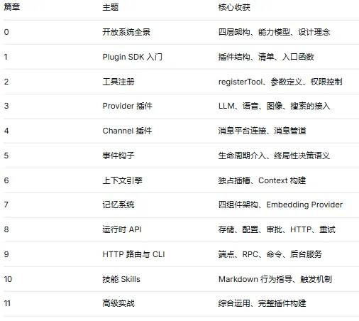 这 12 篇只是一个起点。OpenClaw 的插件生态正在快速发展,100+ 的 SDK 子路径中还有更多能力等待探索。建议结合官方文档持续深入学习。