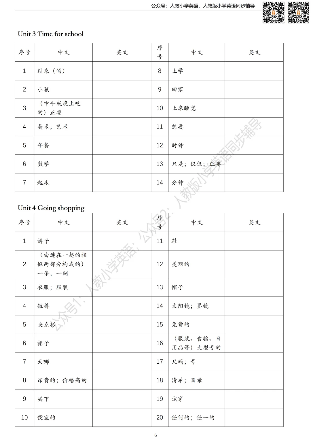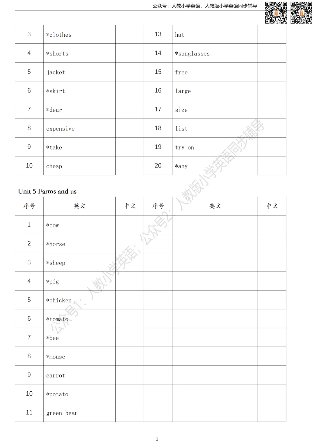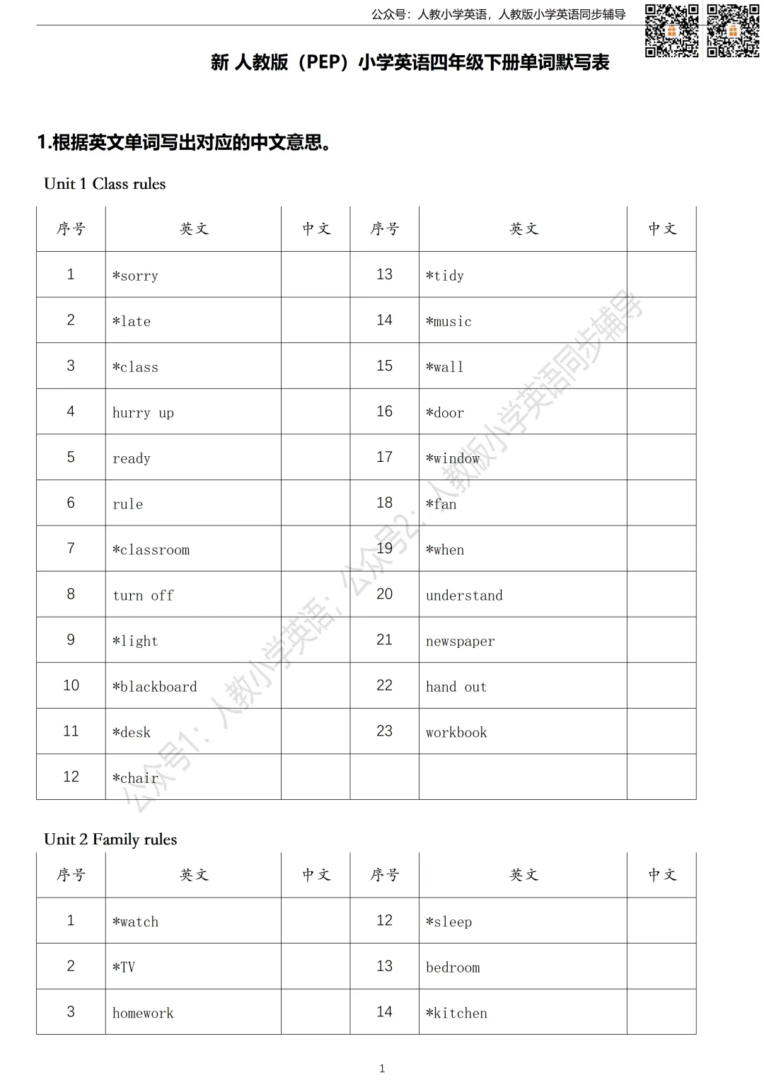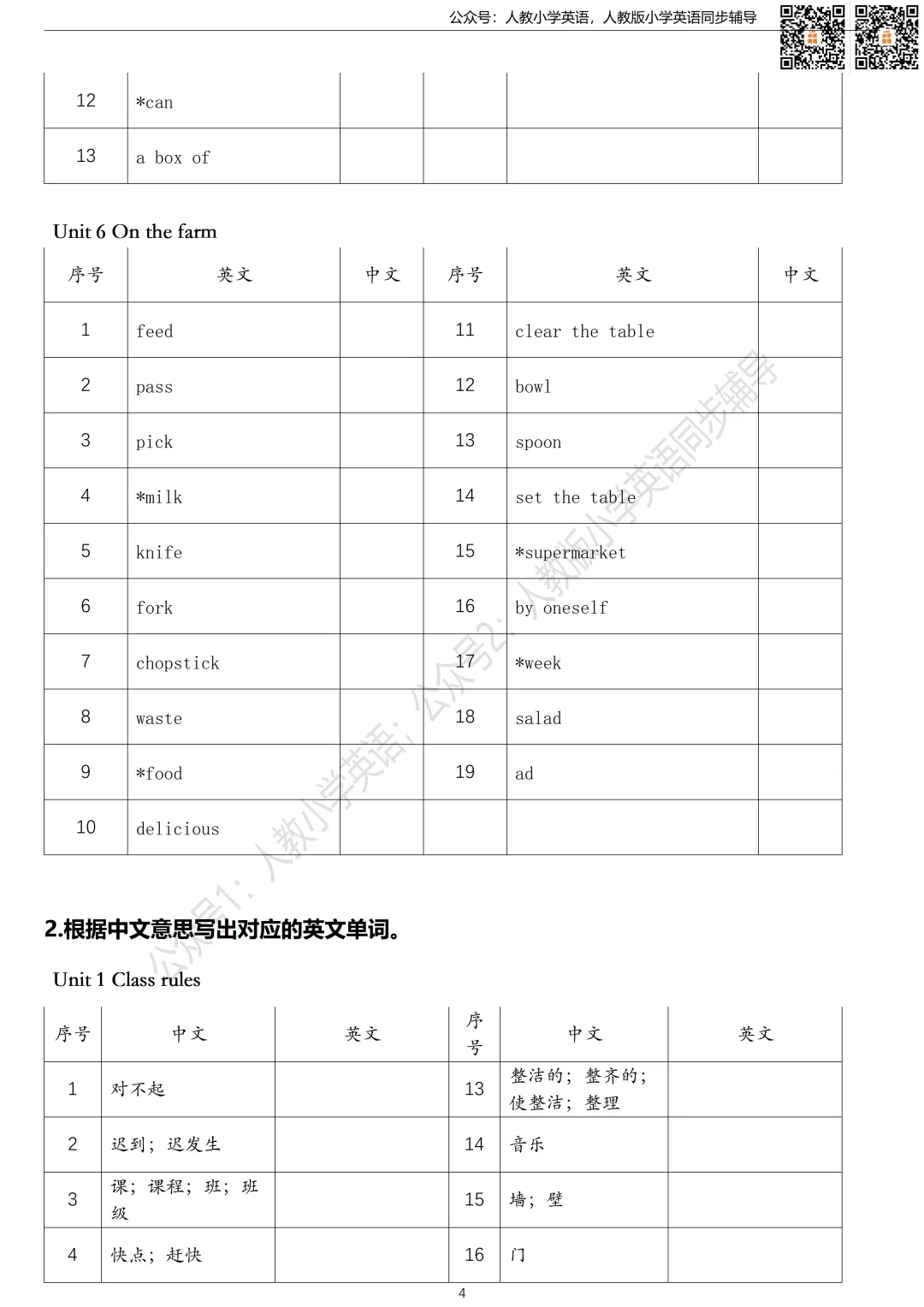 怎样获取打印版? 扫描下方二维码 进入“人教小学英语”微信公众号 点击公众号首页左下方键盘图标 发送消息“PEP四年级单词默写表” 即可获取打印版(不是在留言区哦)