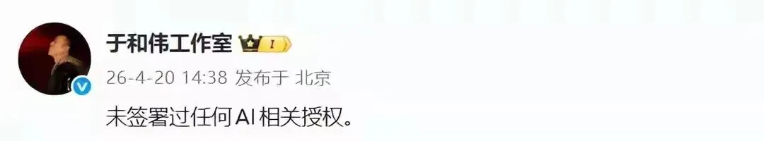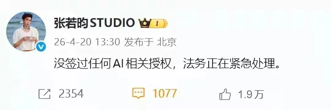 消息一出,迅速登上微博热搜榜首。然而,张若昀工作室官方微博紧急发文:“没签过任何AI相关授权,法务正在紧急处理。”于和伟、李一桐、王玉雯、陈哲远等多名艺人或其团队也纷纷发声,称“未签署任何影视AI授权”“不信谣不传谣”。