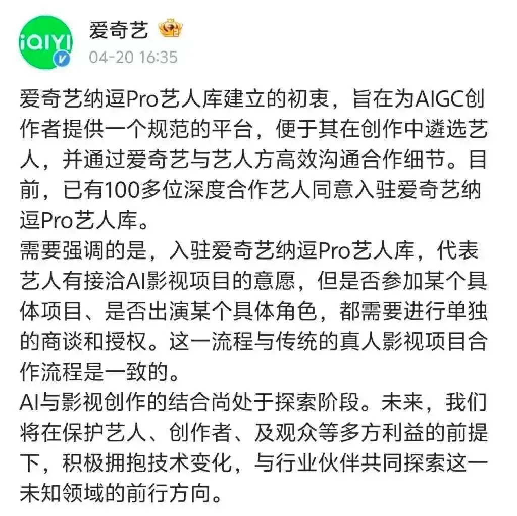 面对舆论,龚宇解释称,目前看到的演员清单只是表达了“谈的意愿”,具体合作还需细谈,艺人是否参演仍需其本人同意。爱奇艺随后发布微博回应:入驻艺人库仅代表艺人有接洽AI影视项目的意愿,是否参加具体项目需单独商谈和授权,流程与传统真人影视一致。爱奇艺称已有100多位深度合作艺人同意入驻。