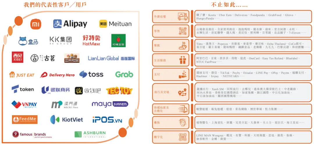 同时,据同一资讯来源,商米科技已服务全球前五十大食品及饮料企业中超过70%的公司。在中国,公司已实现超过70%的餐饮百强企业覆盖率及超过60%的百强连锁商店覆盖率。另外,公司的客户还包括全球领先零售及电商企业(如山姆会员店、全家便利店、泡泡玛特、阿里巴巴、京东及拼多多),以及领先的外卖平台(包括Glovo、Uber Eats、Keeta及Foodpanda)。截至2024年底,全球前十大外卖平台中有七家采用公司的解决方案。下图为公司的部分代表性客户/用户。
