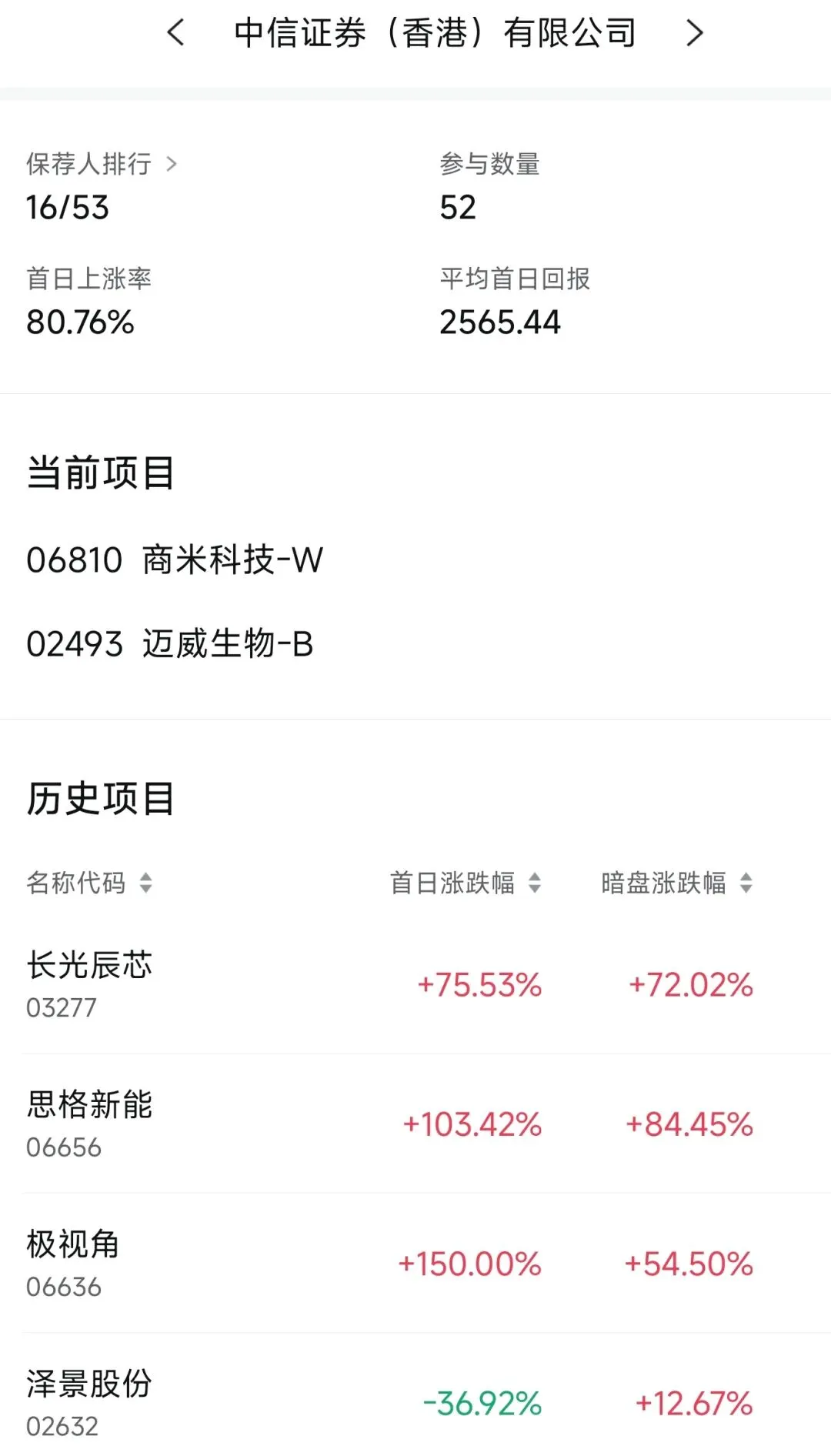 在中信证券近2年保荐的港股项目中,首日上涨率为80.76%,平均首日回报2565.44港元。