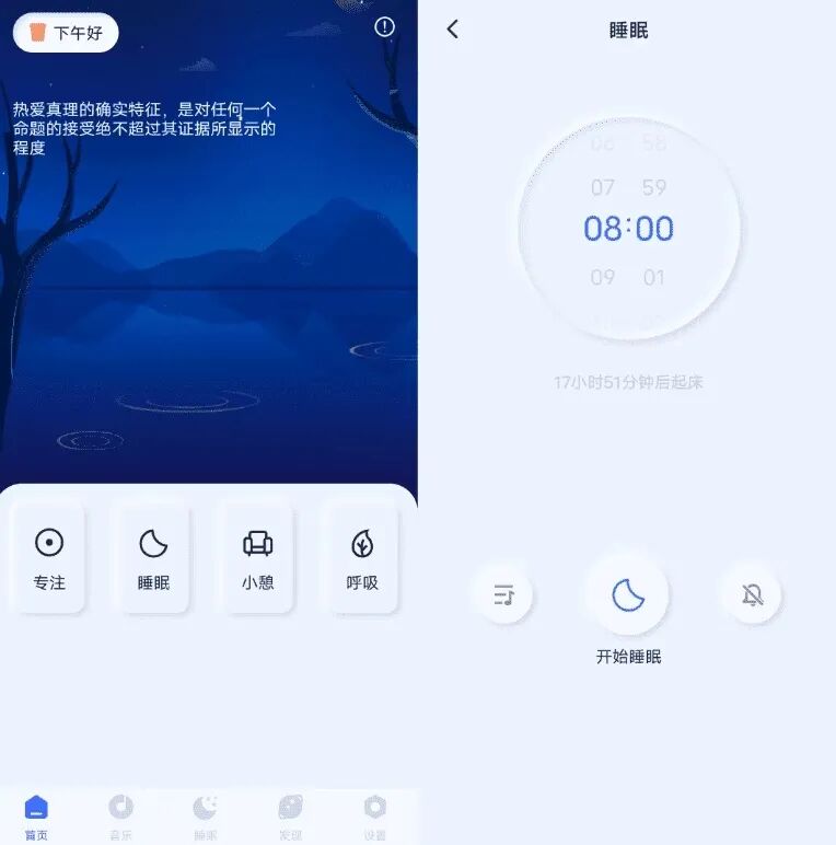 场景模式也有好几种,睡觉是主打,另外还有专注模式、小憩模式、呼吸模式。想专心干活儿学习、中午眯一会儿,或者心里烦的时候跟着做几组呼吸,都能找到合适的,身心放松这块儿照顾得挺周到。