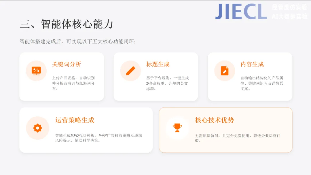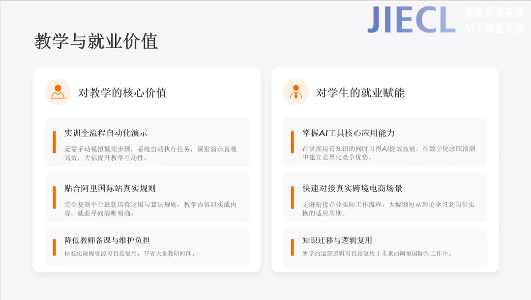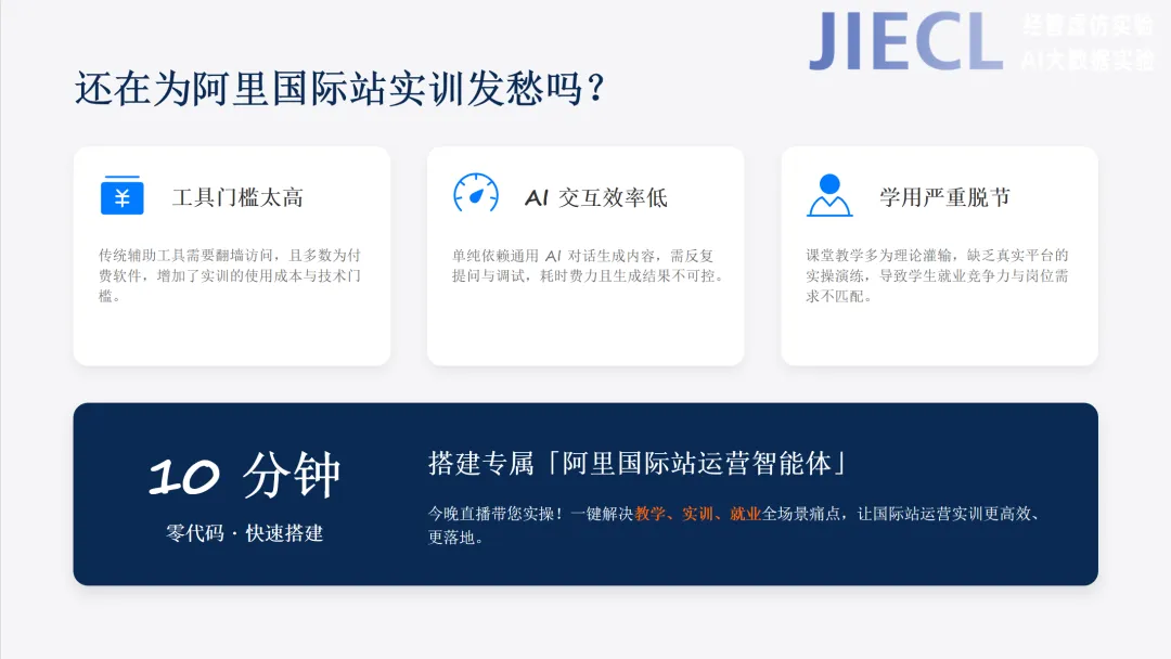 为了解决这些教学痛点,本次杰科力AI智能体设计实验直播,将带大家用最简单的方式,零代码搭建专属阿里国际站运营智能体,让AI真正服务于课堂实训与学生就业能力提升。