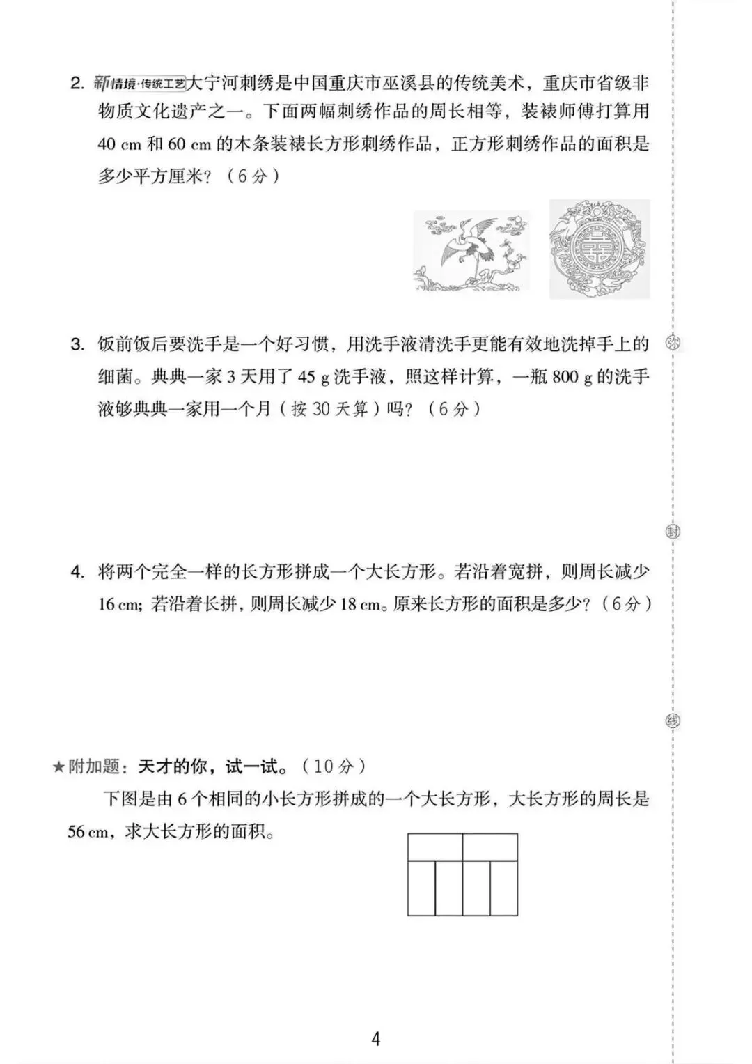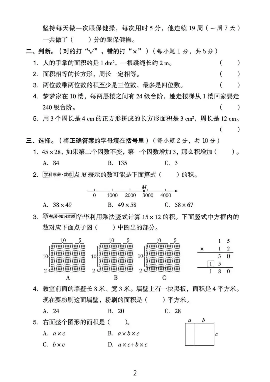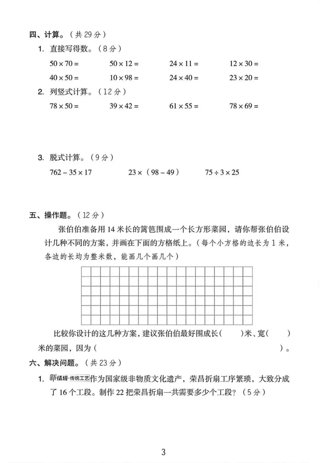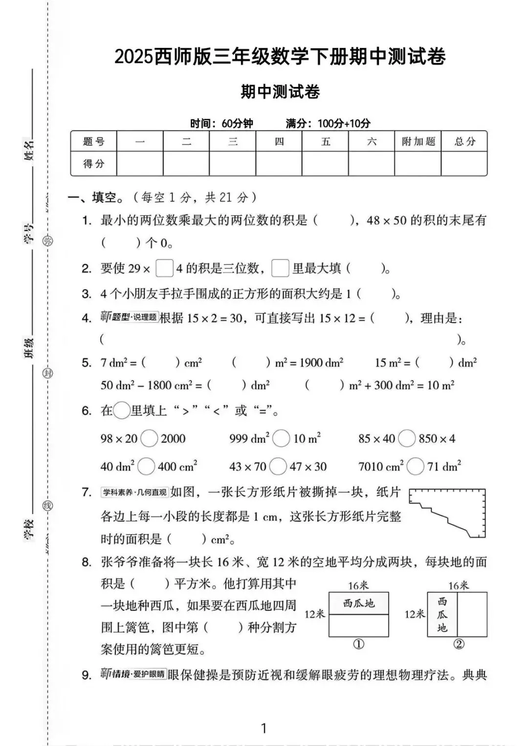 西师版三年级下册数学 期中测试卷(完整电子版可打印)