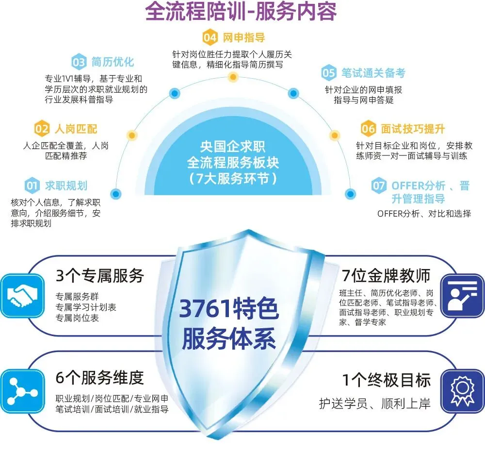 针对想要进入央国企、名企、大厂就业的学生,在就业各个环节提供1对1专业且系统的培训指导,提升学生的求职笔试面试能力。