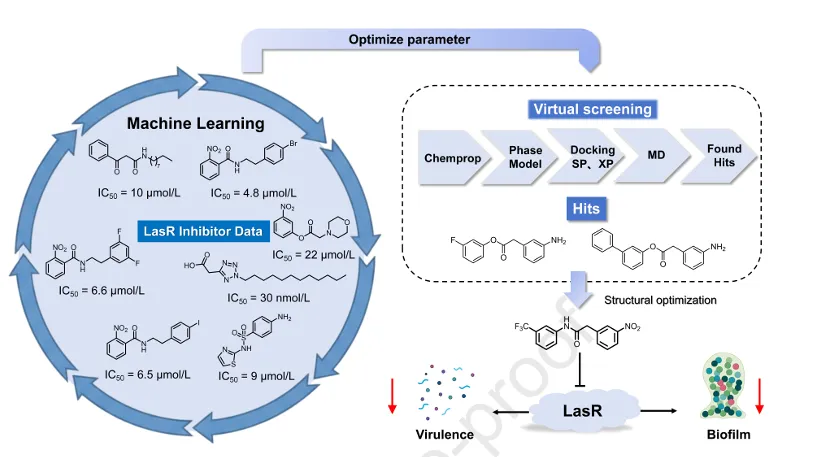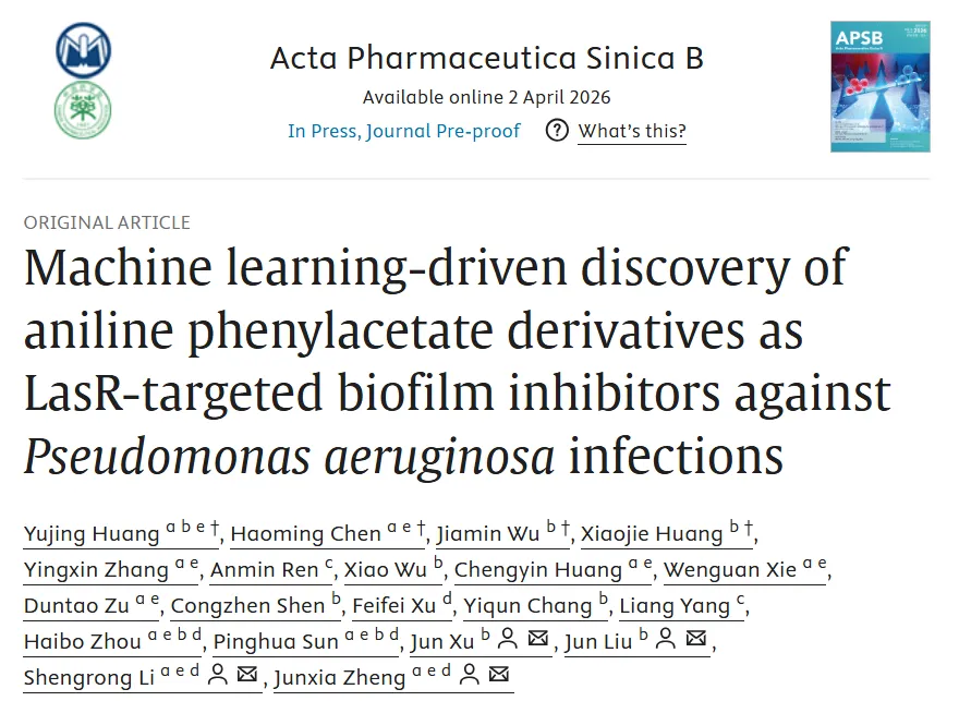 面对铜绿假单胞菌(P. aeruginosa)等超级细菌构筑的坚固生物膜“堡垒”,传统抗生素往往束手无策。由于群体感应(QS)系统——尤其是核心调控蛋白LasR——主导着生物膜的形成与毒力表达,靶向QS成为了极具前景的“反毒力”策略。近期,广东工业大学生物医药学院郑俊霞教授团队、暨南大学药学院刘君教授和徐俊教授团队在药学顶刊 Acta Pharmaceutica Sinica B上发表重磅成果:他们通过一套精密的机器学习(ML)筛选管线,成功挖掘出一款极具临床转化潜力的先导化合物——苯基乙酸苯胺衍生物2g。