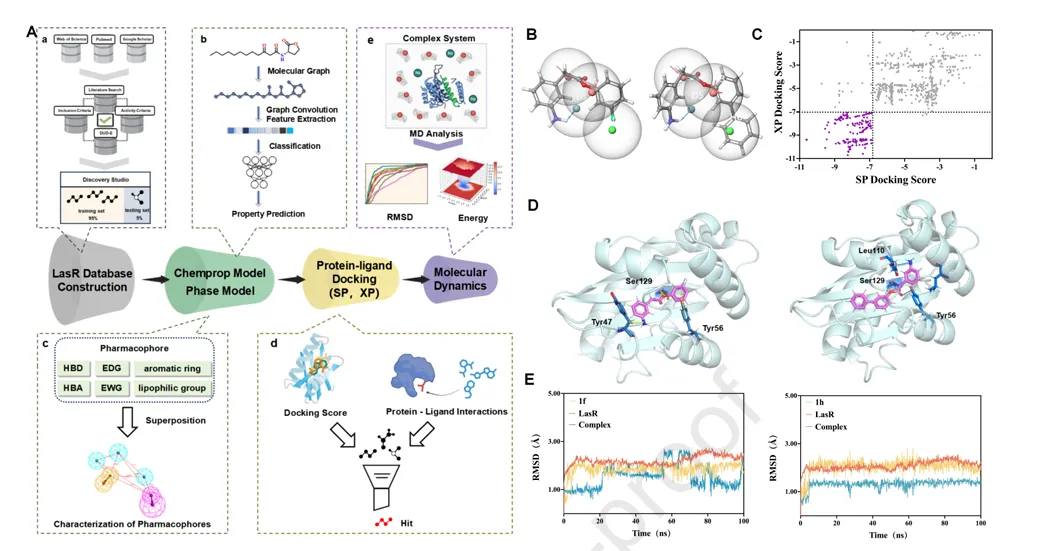 在浩瀚的化学空间中寻找具备高LasR抑制活性的分子,无异于大海捞针。研究团队没有盲目试错,而是构建了一套所向披靡的“AI筛选漏斗”:他们整合图神经网络(GNN)、药效团模型、分子对接及100纳秒的分子动力学模拟,对内部化合物库进行了层层过滤。从初始的4万余个分子中,AI精准捕获了两个高分 hits。