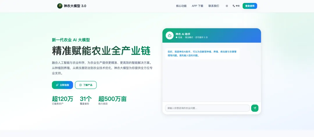 3. 中国农业大学神农大模型——已服务超10万农户,可以关注他们的官方渠道获取使用入口。