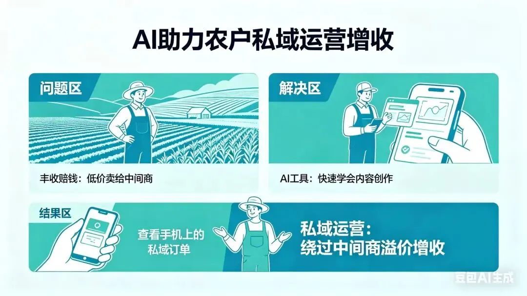 一个合作社的大姐,以前完全不会做内容。用了我们的AI工具,2小时培训就能上手。现在她每天花10分钟,让AI生成文案和视频脚本,发到抖音和朋友圈,一个月多卖了3万块钱的猕猴桃。