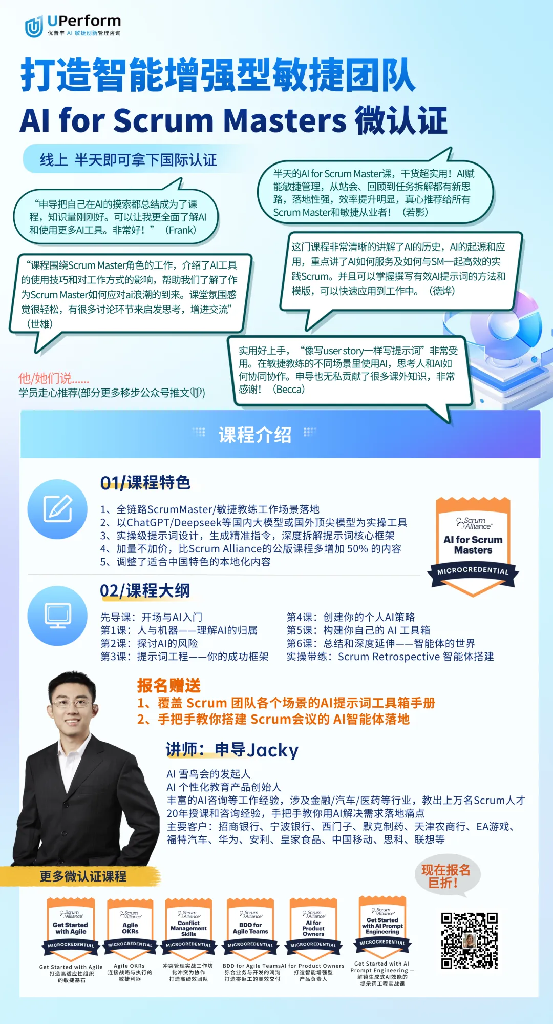在传统的敏捷实践中,我们花费大量时间在数据的收集、整理和基础的流程引导上。而Scrum Alliance 官方推出的 “AI for Scrum Masters” 微认证课程,将教你如何通过生成式 AI 解放你的生产力,让你专注于更具价值的“人与人的连接”。