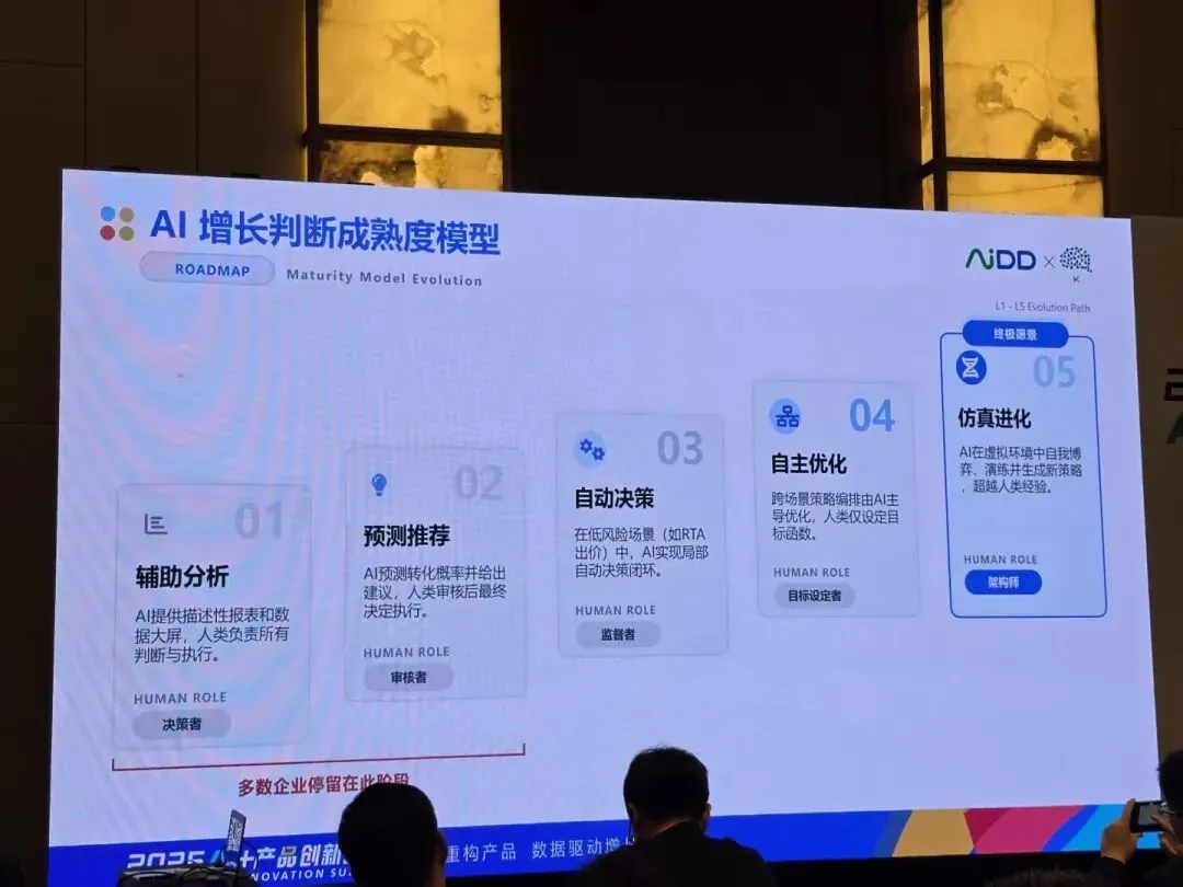 这不是一句口号,而是有具体路径的。现场有个对 AI 能力成熟度的五阶段描述,我觉得说得相当准:从最初的辅助分析,到预测推荐,再到自动决策,然后是自主优化,最终演化为能在虚拟环境中自我进化。