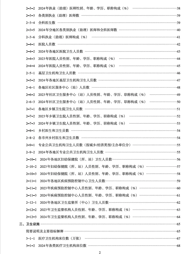 一、《甘肃省卫生健康统计年鉴(2025)》是一部反映甘肃省卫生健康事业发展情况和居民健康状况的资料性年刊。本书收录了甘肃省及所辖14个市(州)和兰州新区、86个县(市、区)卫生健康事业发展情况和目前居民健康水平的统计数据。本书收编的内容截至2024年底。