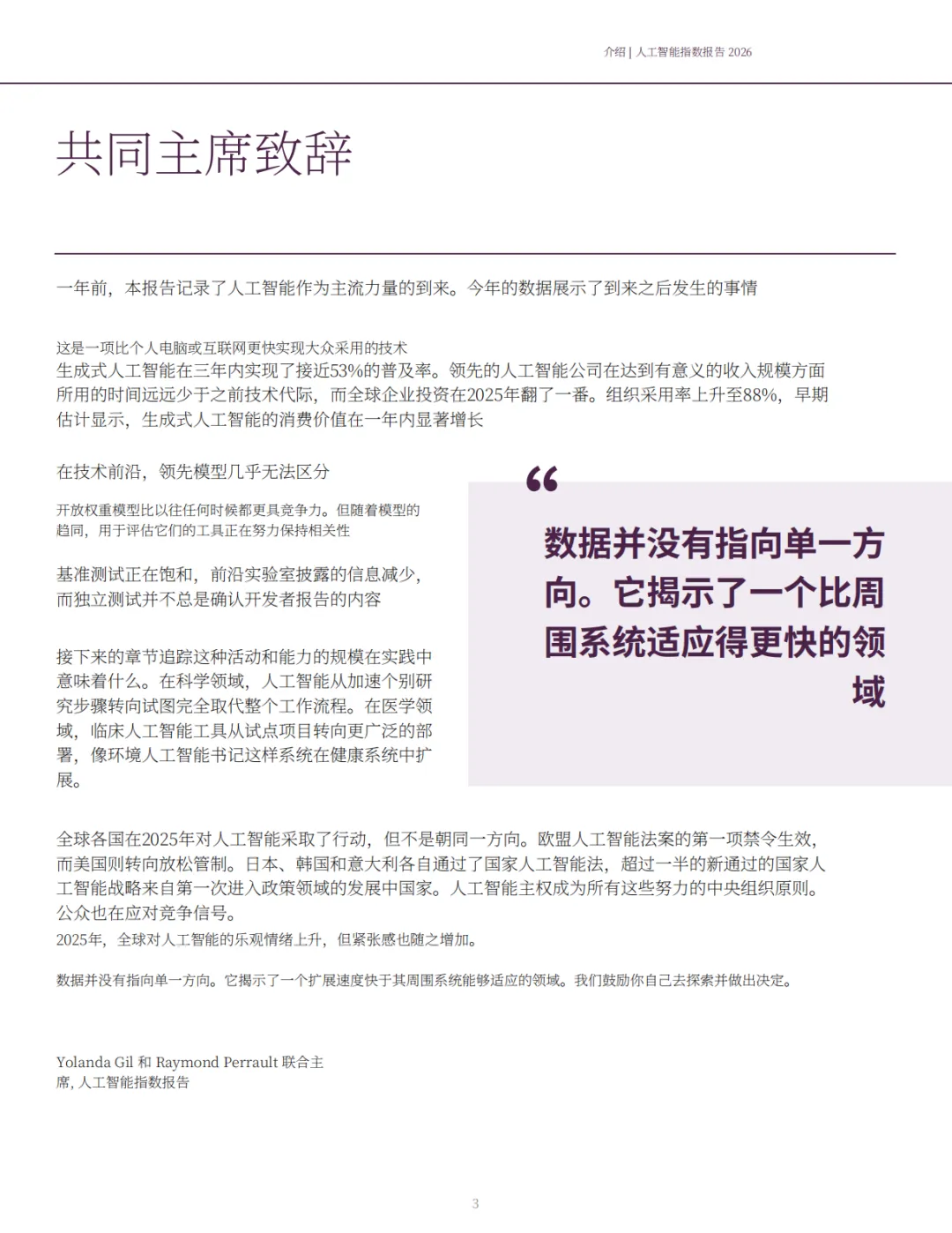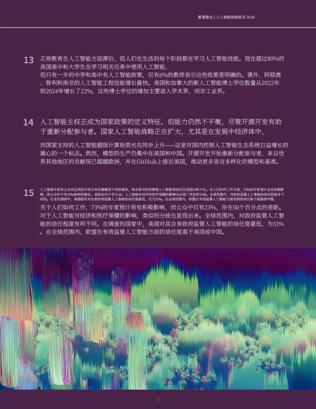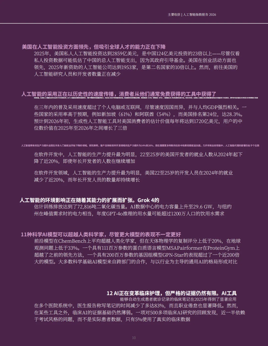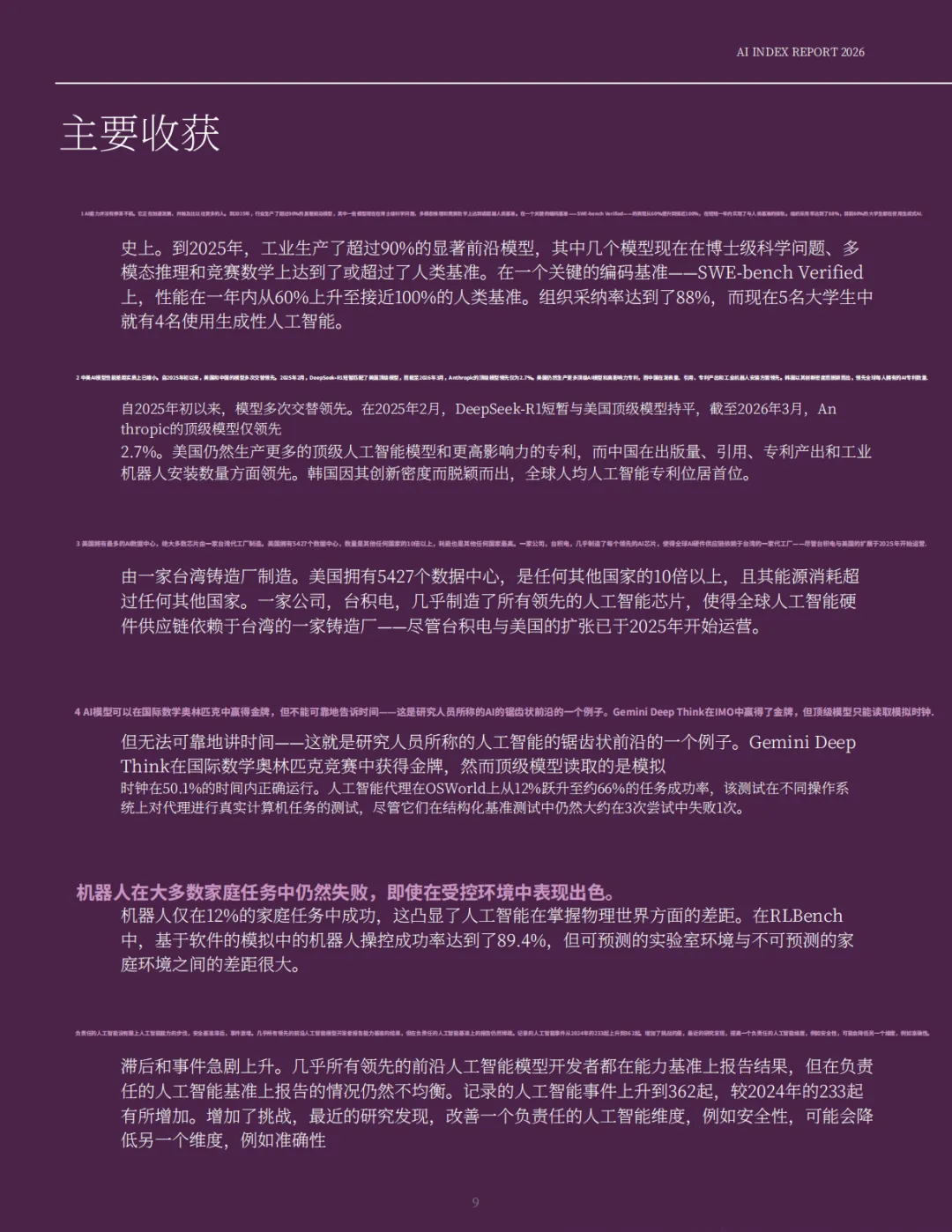 评估与治理跟不上步伐:用于衡量AI的基准测试正在饱和或失效,顶级模型的透明度不升反降。全球治理框架、教育系统和数据基础设施的发展速度未能跟上AI技术本身的进步。
