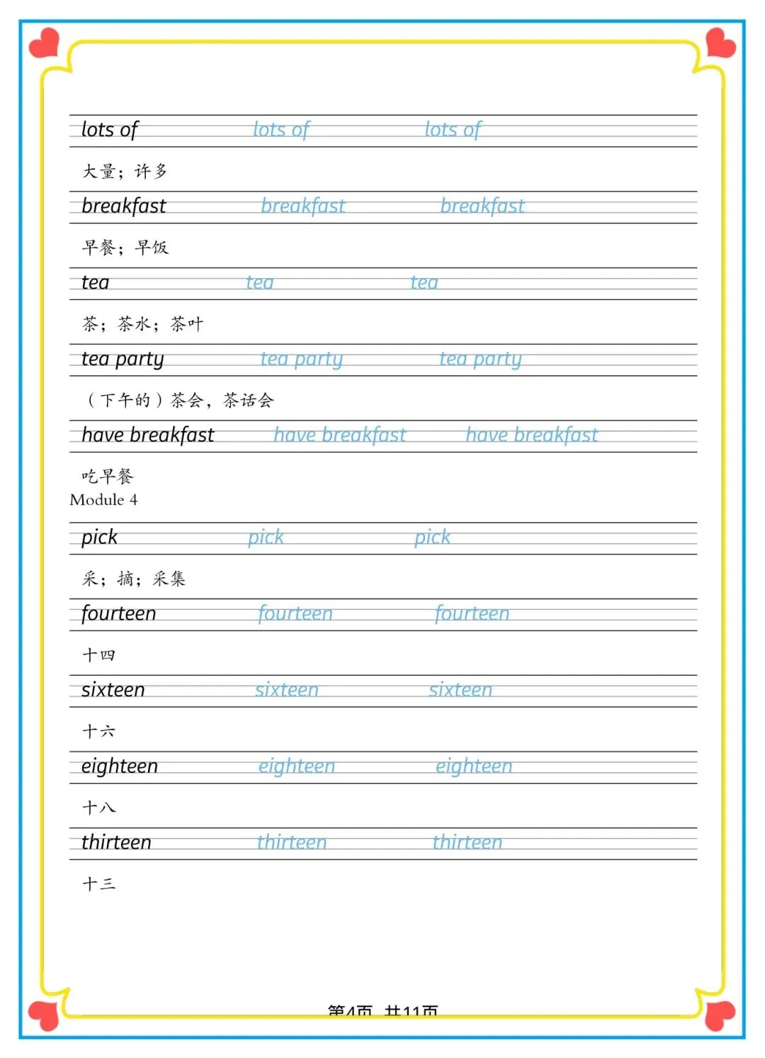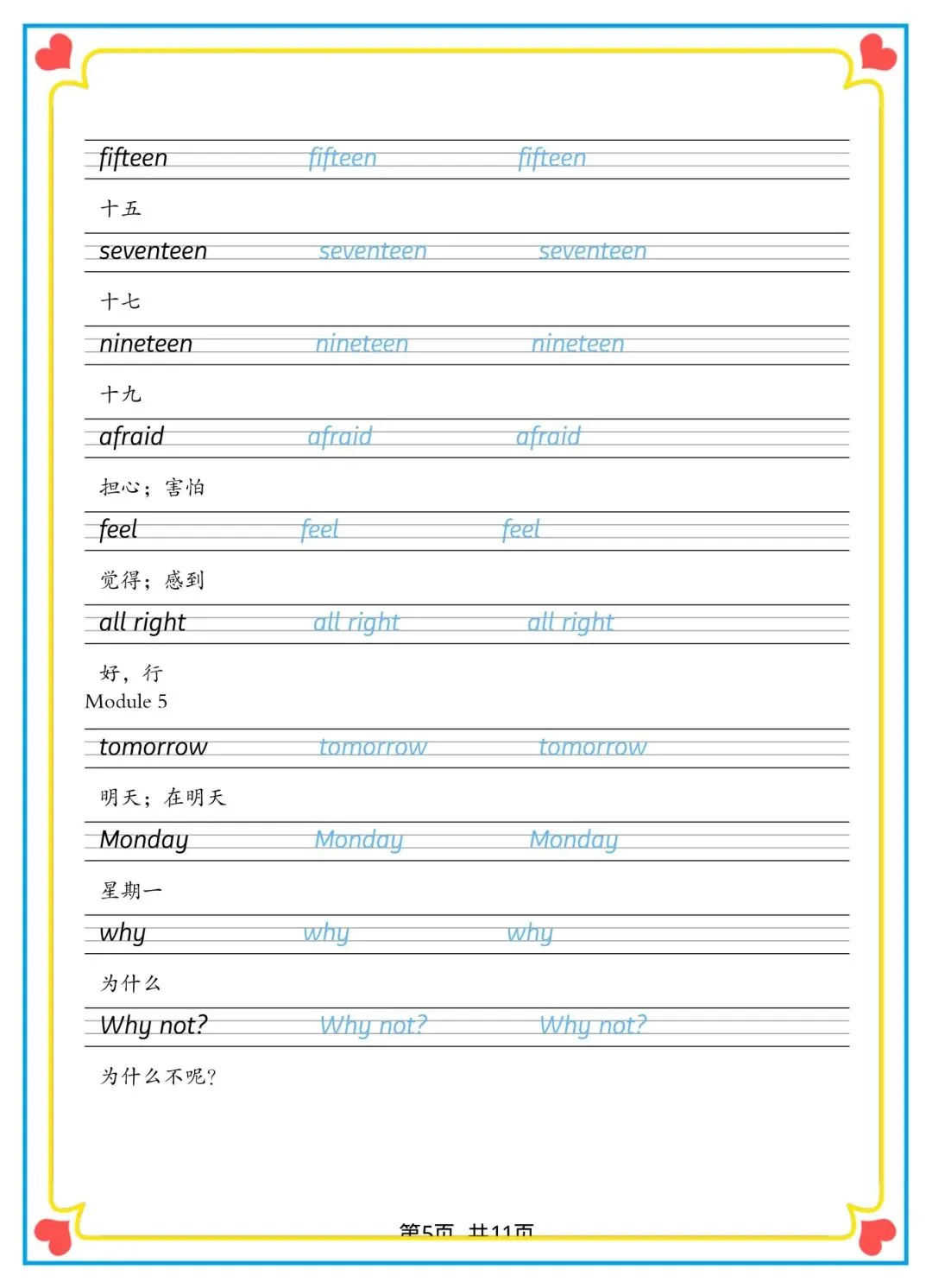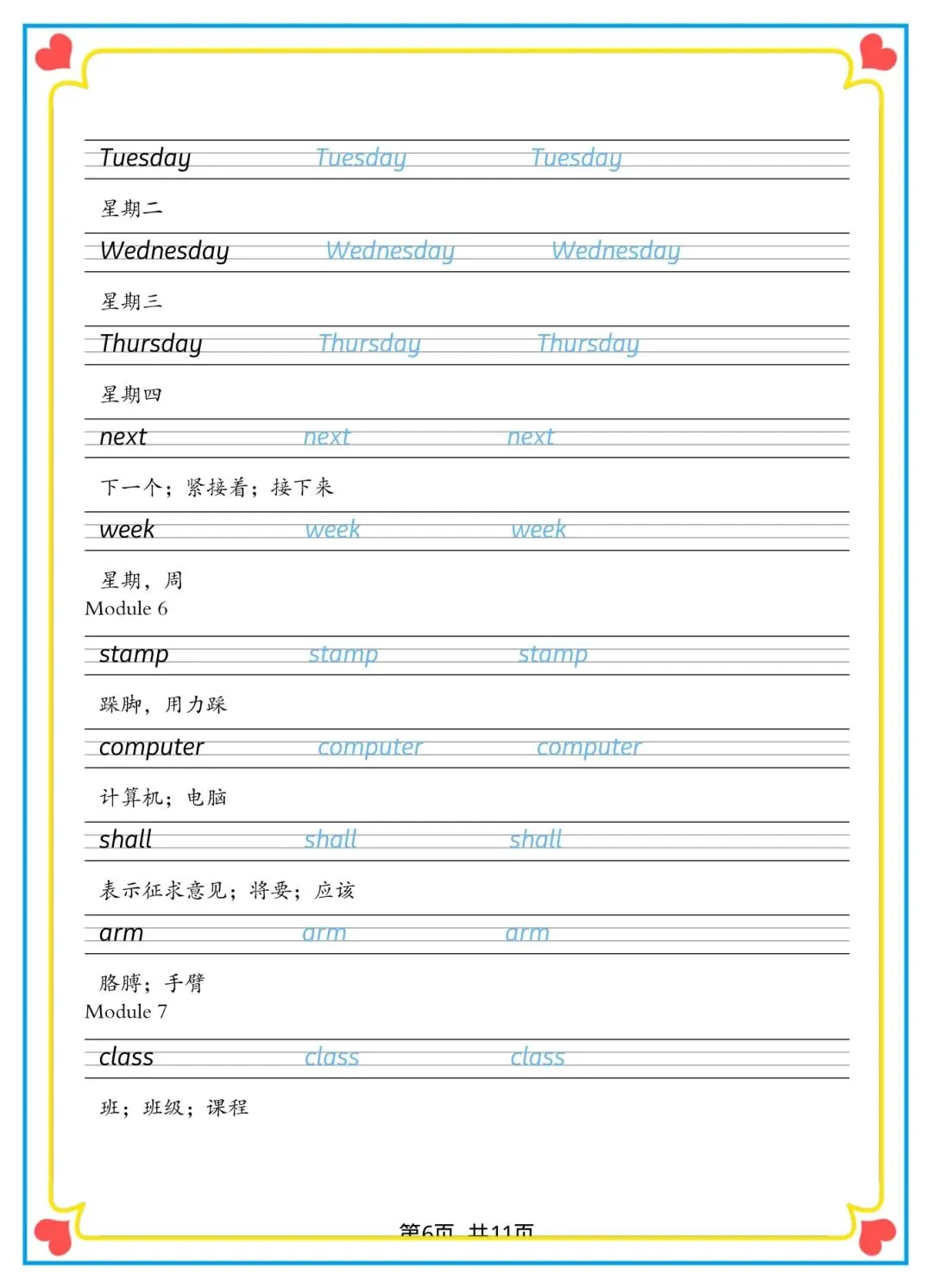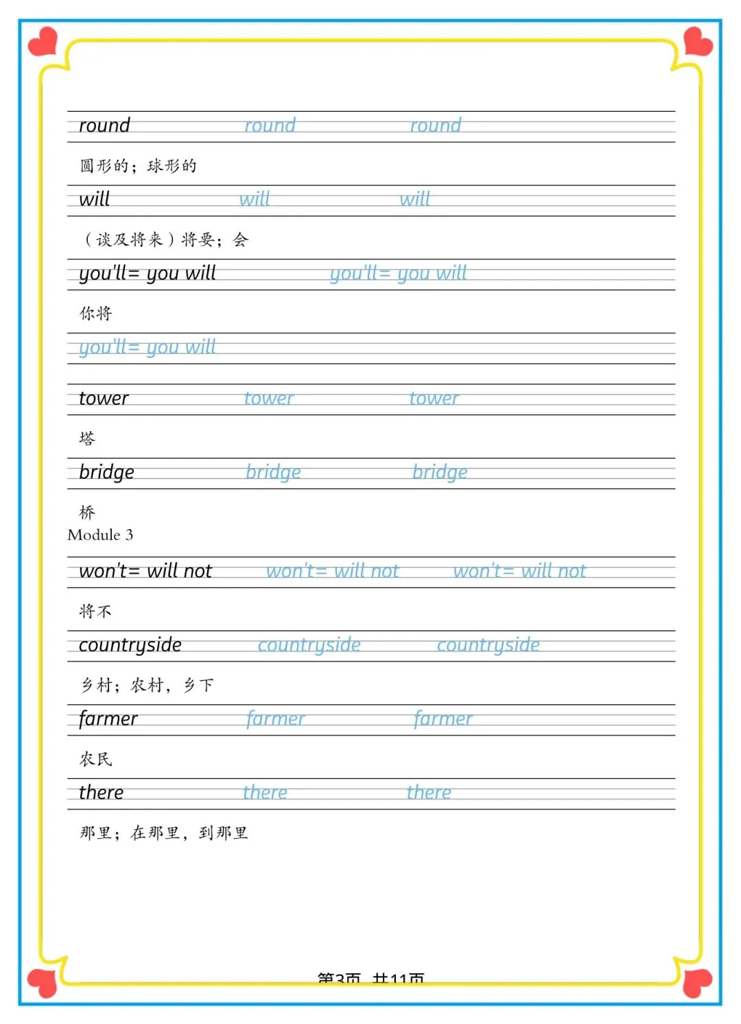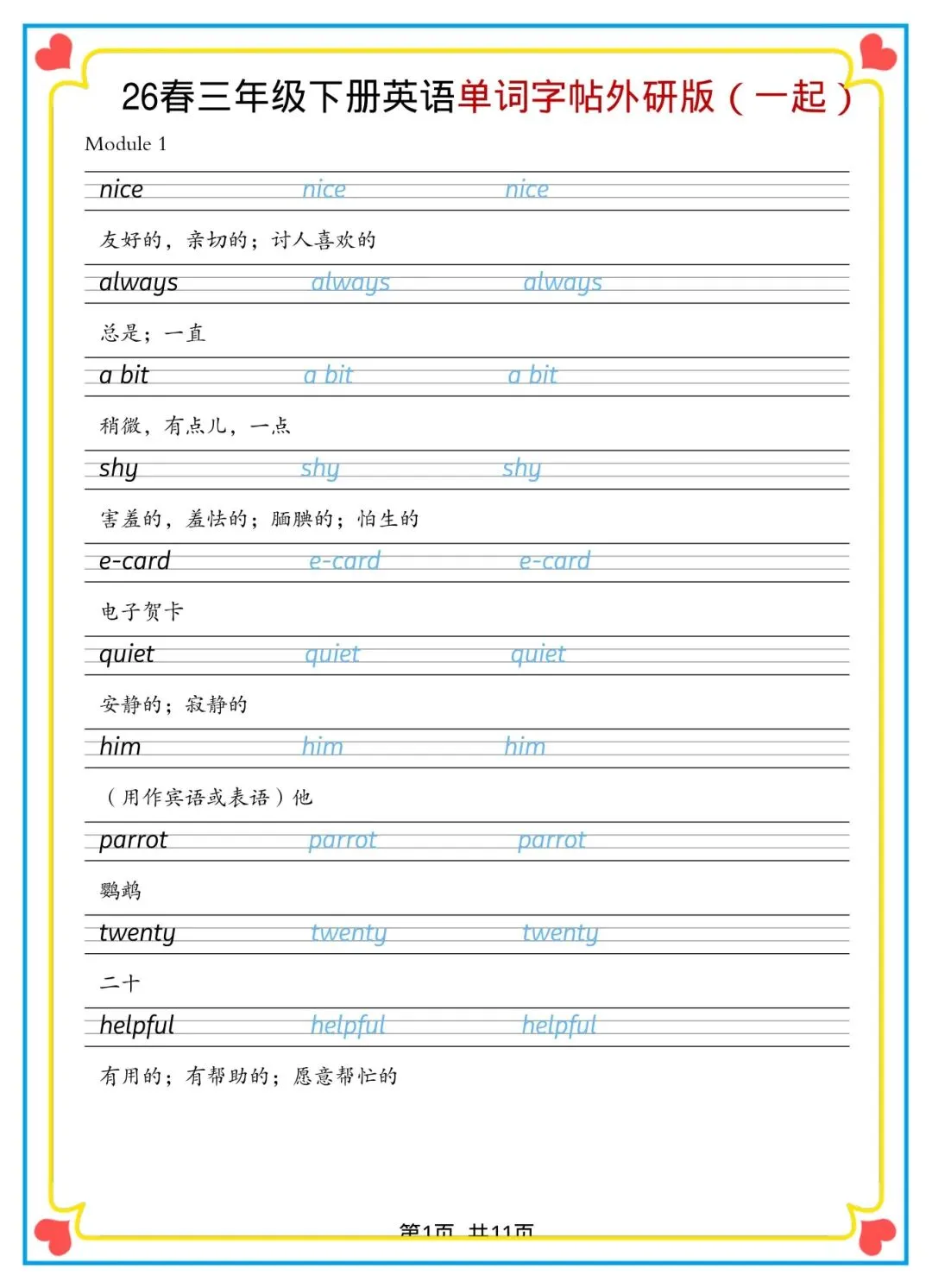 嗨,你好呀!今日分享2026年春外研版三年级英语下册《单词字帖》,共11页,电子版可下载可打印。需要的家长抓紧打印出来,让孩子练一练,写一写吧。