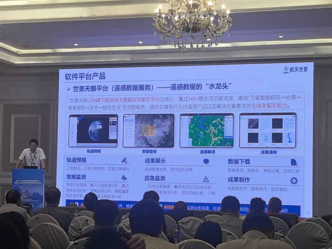 航天世景公司总经理助理、研究员隋正伟在大会上做题为《卫星遥感+人工智能在时空信息服务中的融合应用探索》的特邀报告。他指出,随着商业卫星系统和人工智能技术的发展,AI技术深度应用于自动化基础数据处理、规模化增值产品生产以及智能化信息产品提取,结合世景天眼等平台软件产品,在各行业应用中正在发挥更加深入和业务化的作用。报告结合公司在智慧水利、自然资源、应急管理等领域的多个典型案例,生动展现了如何将海量遥感数据高效转化为可直接赋能业务决策的“信息产品”,有效解决了传统遥感应用中数据使用门槛高、响应滞后等行业痛点。