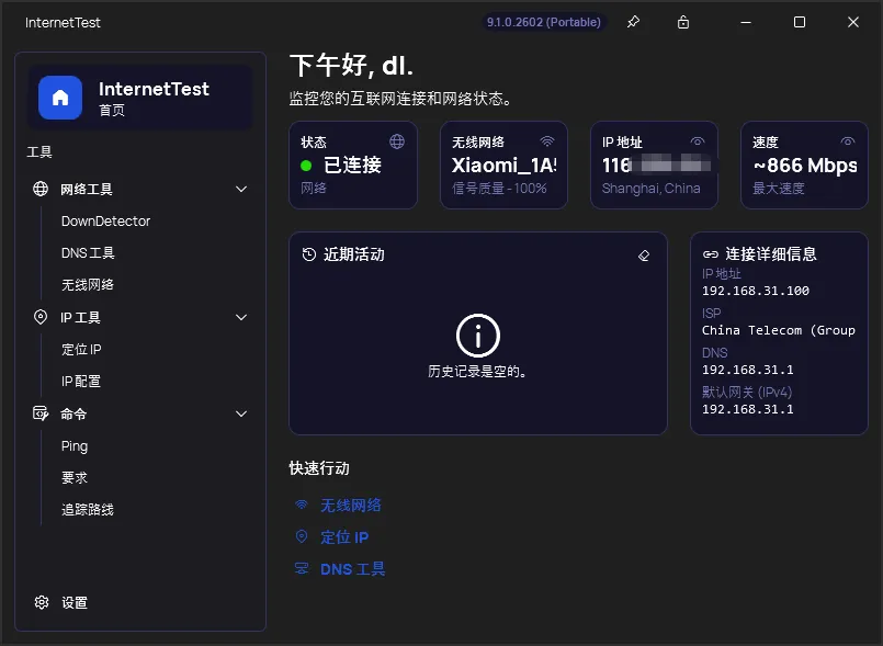 一款在Windows上用来查看、检测和排查网络问题的工具,集成了常见的网络测试功能,比如IP查询、Ping测试、DNS查询、WiFi信息查看等,方便在一个地方处理网络相关的操作。