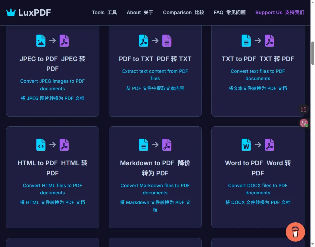 支持PDF与多种格式互转,包括JPEG、PNG、TXT、HTML、Markdown、Word、Excel、PowerPoint、SVG、WEBP等转PDF