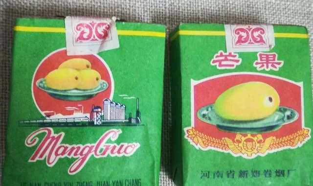 这两小包绿壳的是芒果香烟,外面画俩金黄大芒果放在盘子上,这个河南出的,烟丝切得碎乎,一盒抽完嘴里余味甘甜,妈妈年轻时候就在车间门口买过芒果烟,说以前车间姐妹结伴一人来一支,手忙脚乱往兜里揣,回头还得搓掉袖口上的烟灰,芒果香烟的空壳还经常拿来做针包,装几根红头针带着上下班,纸皮厚实可用好几年不坏。