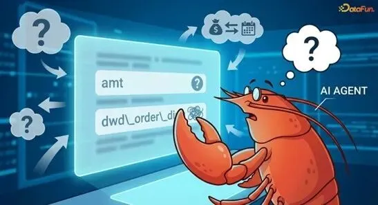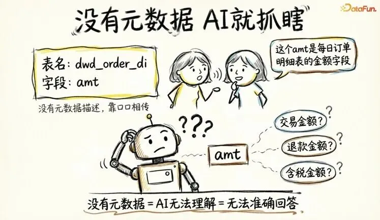 但 AI Agent 不知道。它看到 amt,不确定这是交易金额、退款金额,还是含税金额。没有完整的元数据描述,AI 就像一个入职第一天的新员工,面对一堆缩写和行话,完全懵了。