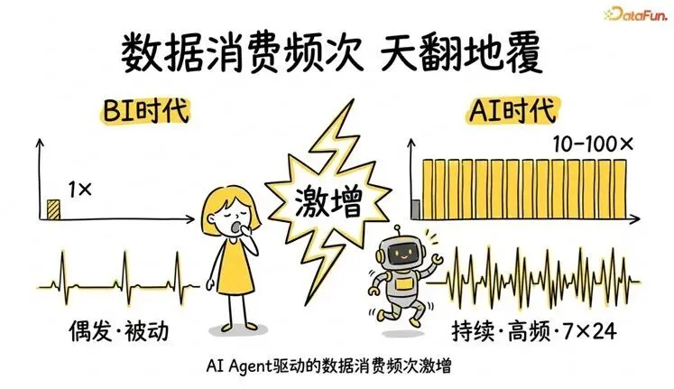 AI Agent 不一样。它是 7×24 小时不间断运行的。一个企业可3能同时有上百个 Agent 在跑——客服 Agent 查客户画像,销售 Agent 分析成交趋势,运营 Agent 监控实时指标。数据查询的频次可能是过去的10 到 100 倍。