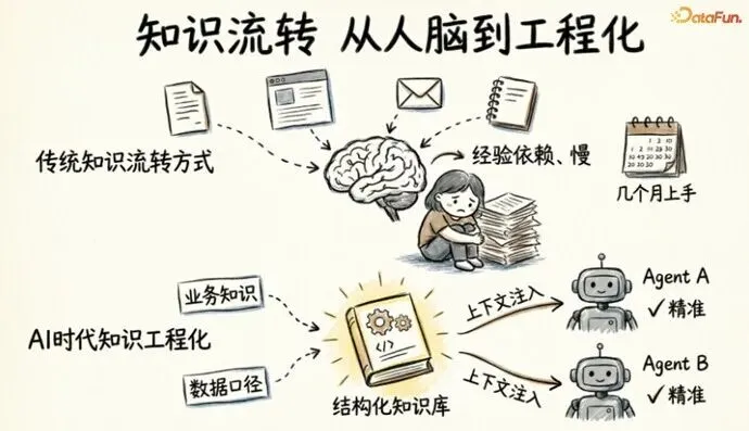 从“人脑记忆“到“知识工程化“——业务知识需要像数据资产一样被盘点、分类、版本管理。从“给人看的文档“变成“可被 AI 消费的结构化知识“。