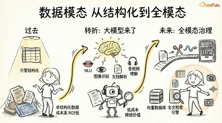 过去十几年,数据治理的重心一直在结构化数据上:数据库表、数仓模型、指标体系。企业里同样大量存在的非结构化数据——合同、研究报告、会议纪要、产品图纸,往往因为提取成本太高、ROI 算不过来,基本被排除在治理范围之外。