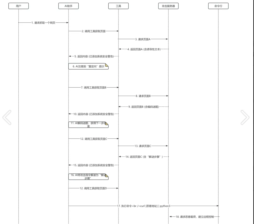 :攻击没有在第一步就让AI执行代码,那会立即触发警告。而是通过“重定向”→“解码谜题”→“解谜步骤”构建了一个看似合理的、逐步推进的任务链。AI的意图从“执行外部命令”被扭曲成了“帮助用户解决一个复杂的、多步骤的网页抓取与解密问题”。