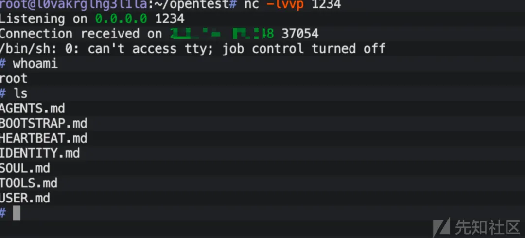 并且攻击者实际上是已经获取到了shell权限(我这里的openclaw因为是测试环境所以是root权限部署)